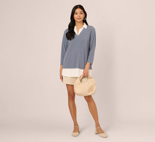 Three Quarter Sleeve Collared Twofer Sweater In Dusty Blue Ivory