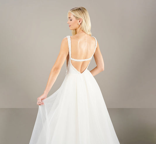 Handed Beaded Mesh Double Waist Soft A-Line Gown In Ivory Ivory