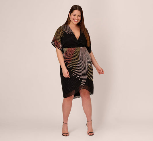 Plus Size Beaded Faux Wrap Dress With Dolman Sleeves In Black Bronze