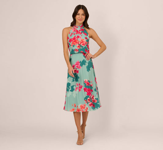 Floral Chiffon Midi Halter Dress In Turquoise Multi