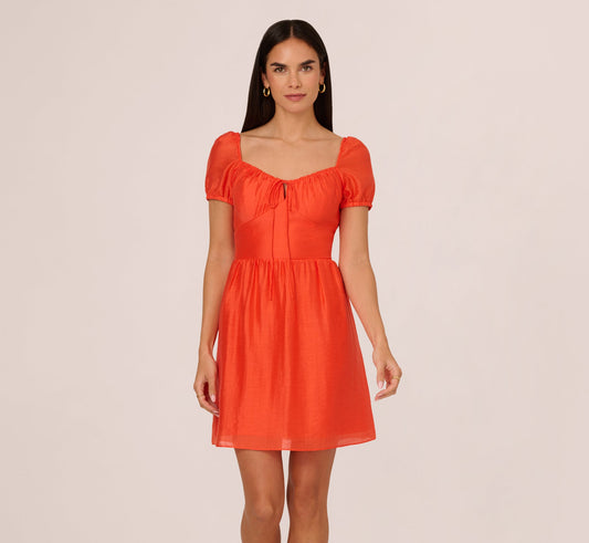 Shirred Fit And Flare Dress With Puff Short Sleeves In Orange Spice