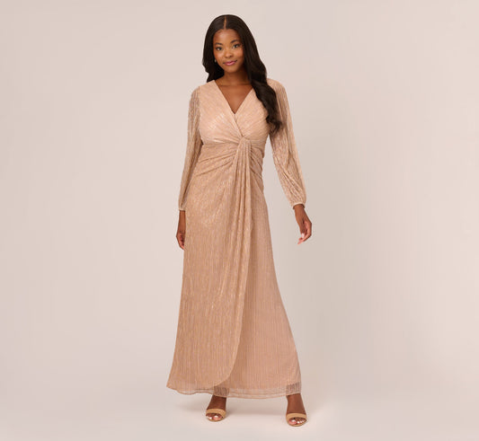 Metallic Crinkled Mesh Draped Long Gown In Light Gold