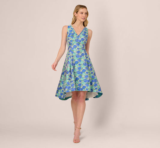Sleeveless Tulip Jacquard Fit And Flare Midi Dress In Blue Green Multi