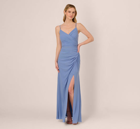Sleeveless Mesh Gathered And Draped Gown In French Blue