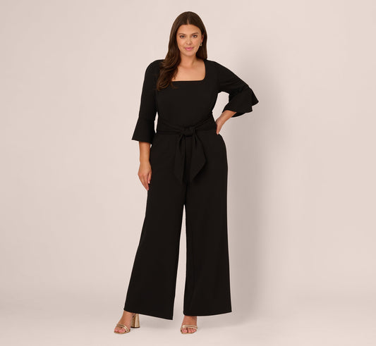 Plus Size Knit Crepe Wide Leg Jumpsuit With Bell Sleeves In Black