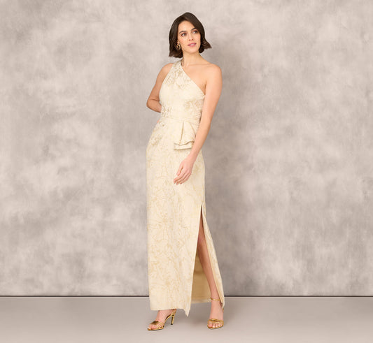 One Shoulder Metallic Stretch Jacquard Column Gown In Light Gold