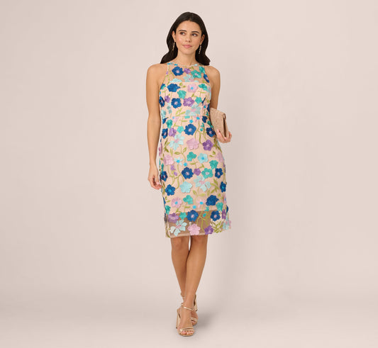 Multicolor Floral Embroidered Halter Midi Dress In Blue Multi