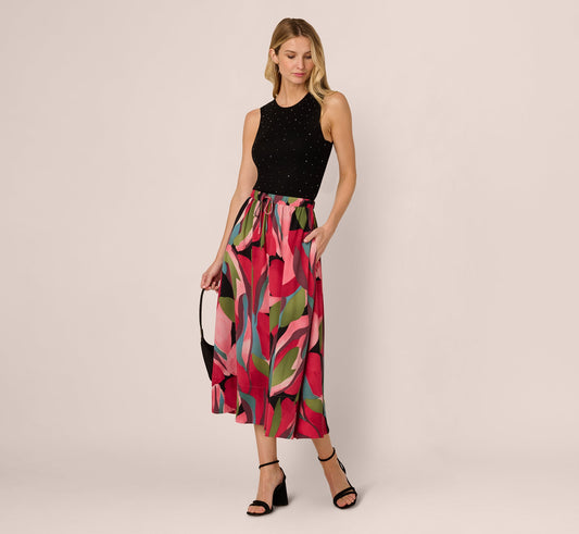 Printed A Line Drawstring Midi Skirt In Mosiac Leaves