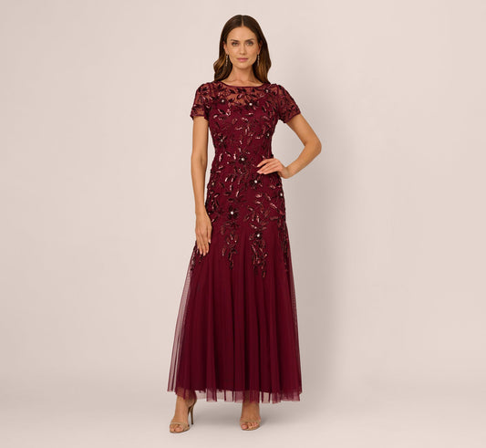Hand Beaded Short Sleeve Floral Godet Gown In Mahogany