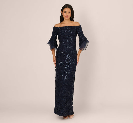 Off Shoulder Bell Sleeve Sequin Lace Gown In Midnight