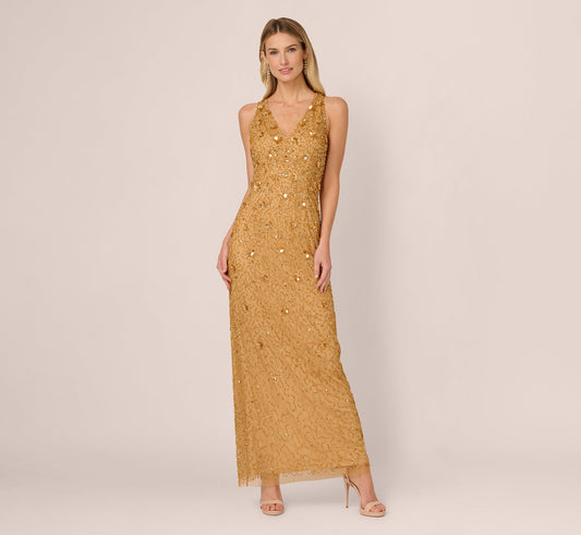 Sleeveless V Neck 3D Floral Beaded Gown In Golden Ray