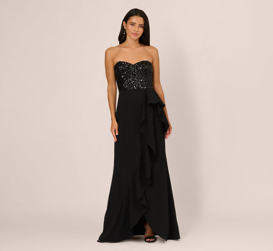 Strapless Sequin Ruffle Combo Gown In Black