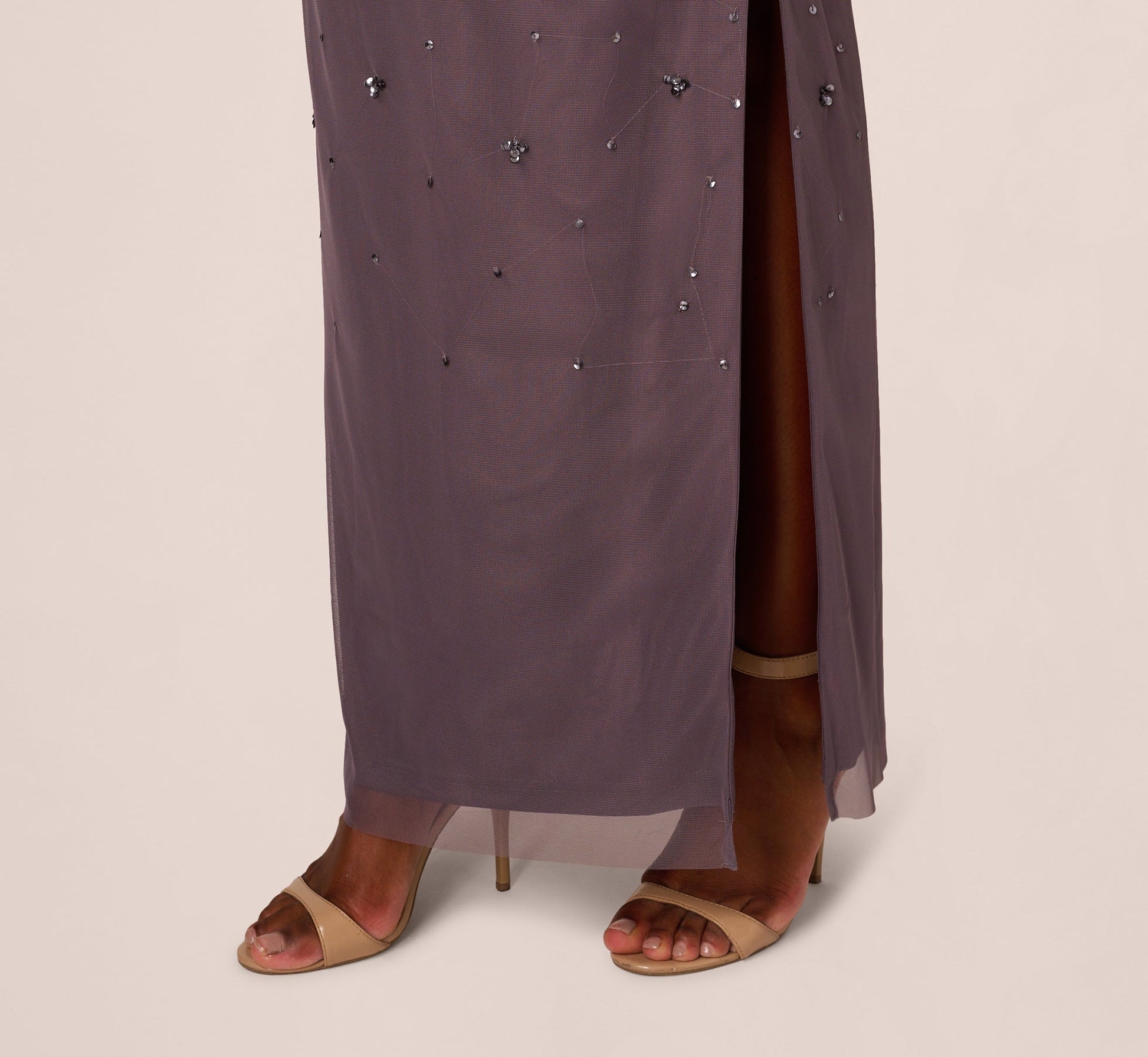 Shimmering and striking, you'll make a stylish statement at all your special events in our floor-sweeping column gown that hugs your curves in all the right places. We're obsessed with the one-shoulder silhouette and the dazzling display of handsewn 3D floral beadwork that dances allover a layer of luxe mesh. Sleek side zip closure.