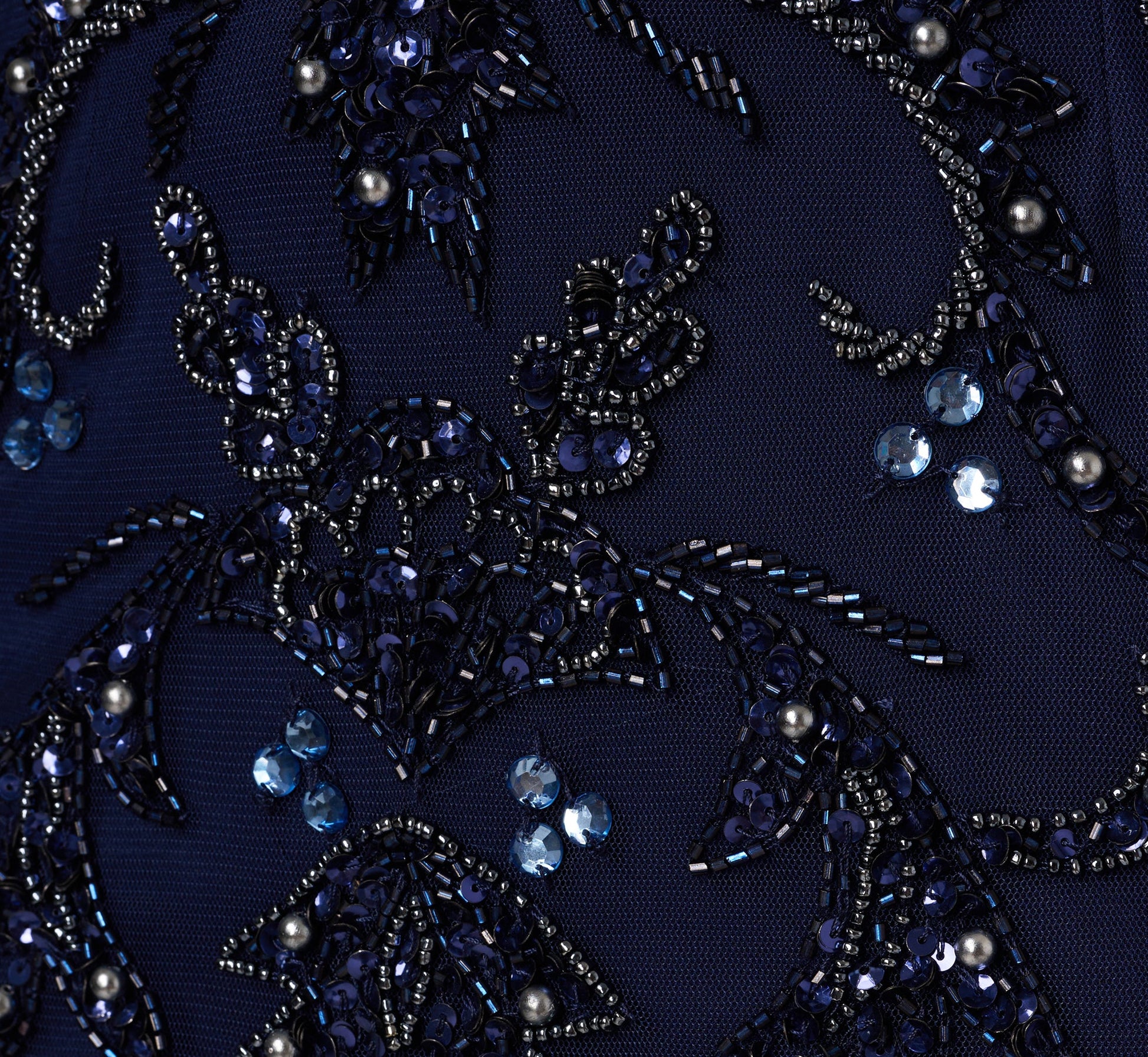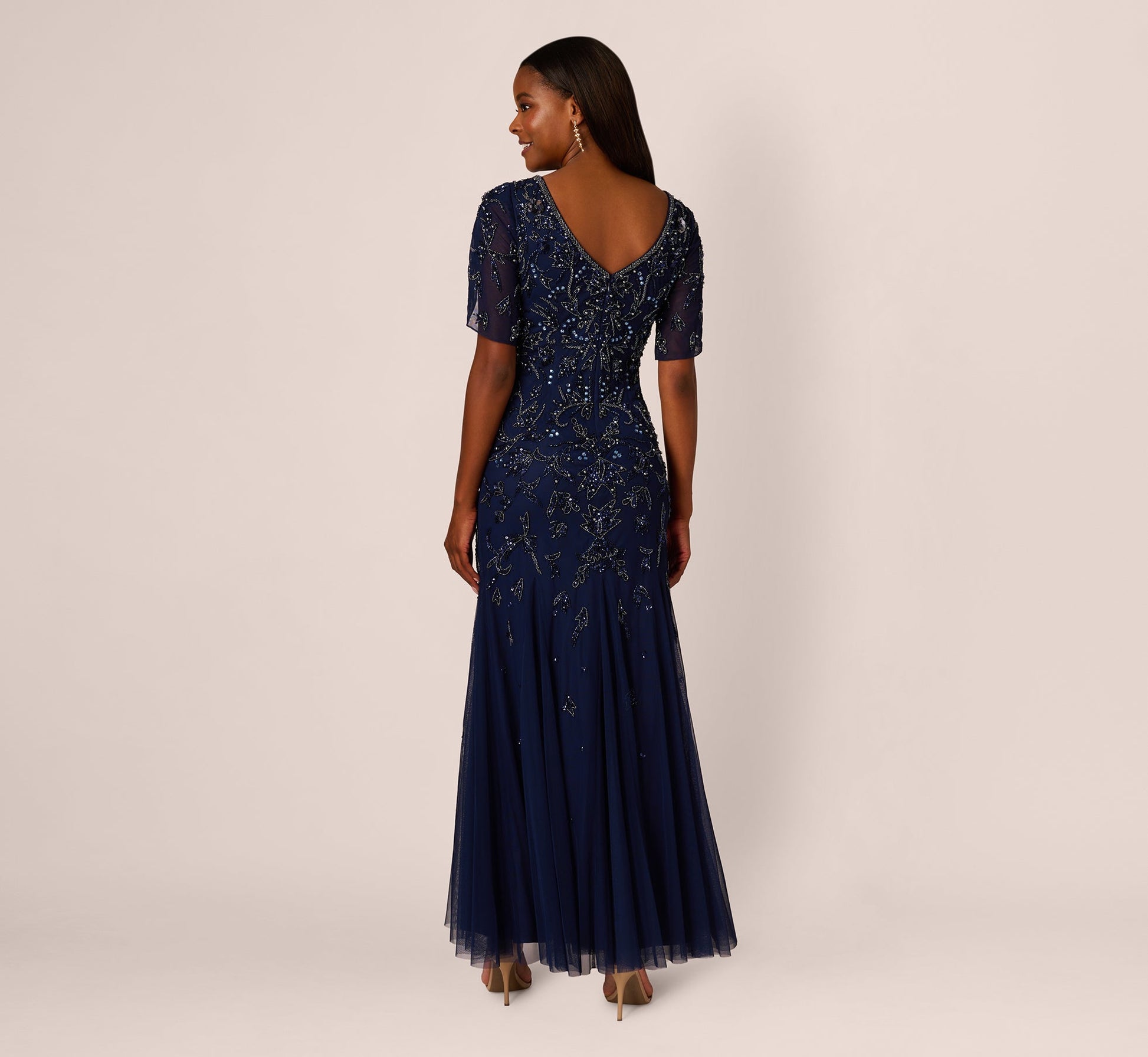 Beaded Mermaid Gown With Sheer Petal Sleeves In Light Navy