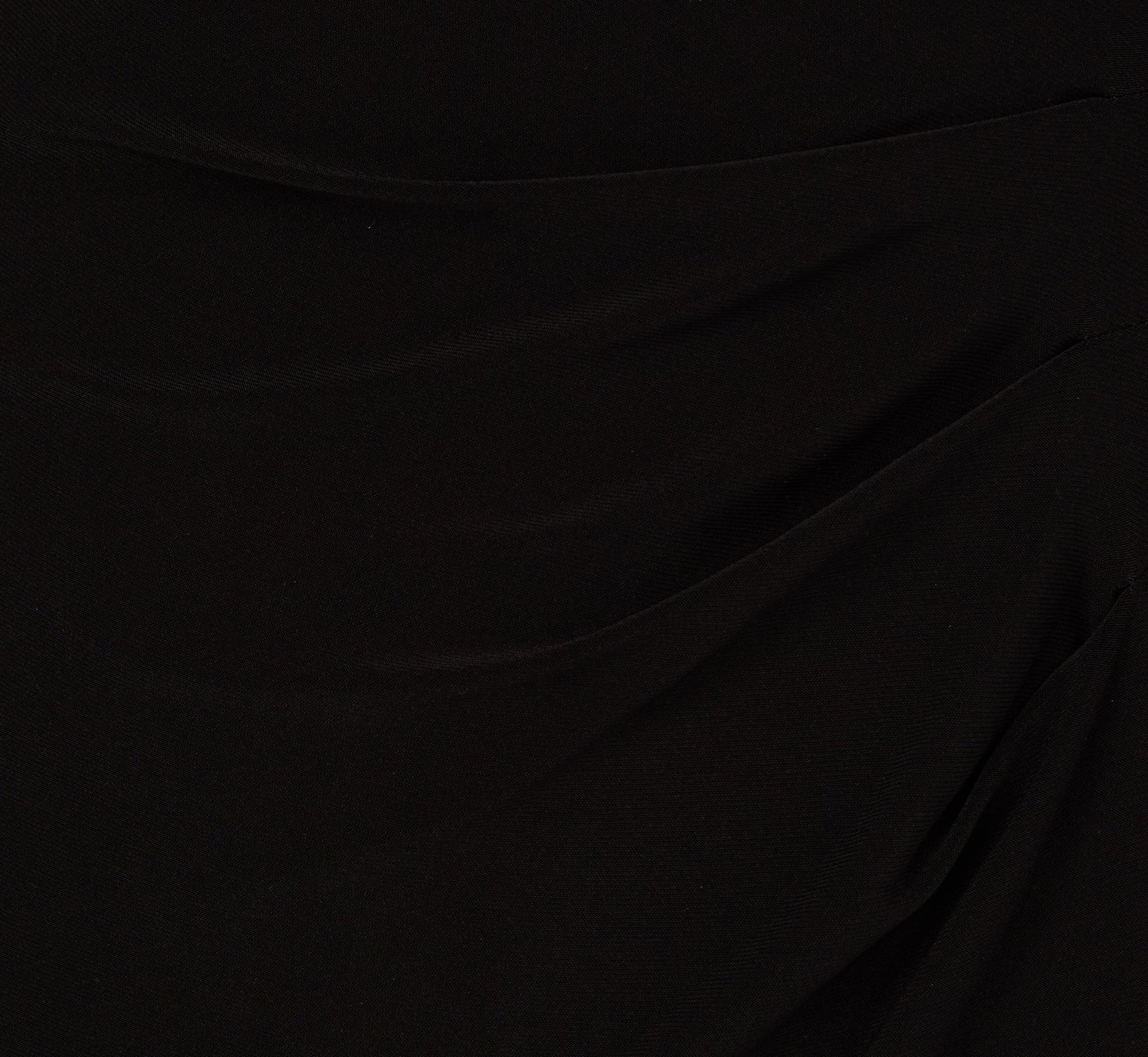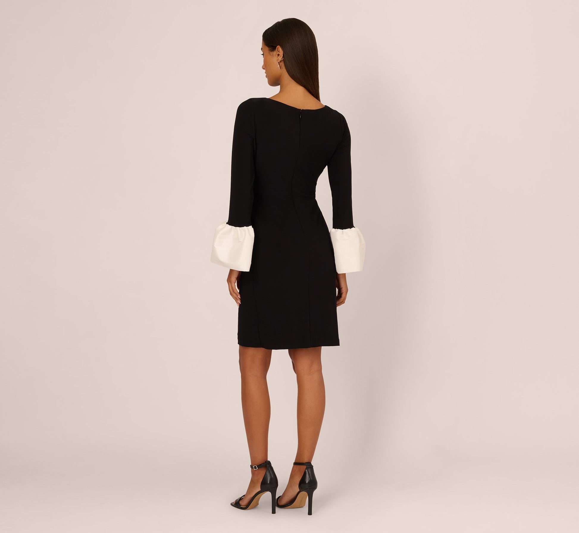 A study in modern elegance, this dress features a sleek sheath silhouette that falls just to the knee. The slinky jersey fabric drapes smoothly, while subtle side ruching adds a touch of soft structure. Long sleeves end in sculptural taffeta cuffs for a dramatic contrast, perfectly balanced by the clean lines of the boat neckline. Refined and polished, this classic dress is an ideal choice for cocktail parties, dinners, or special celebrations.