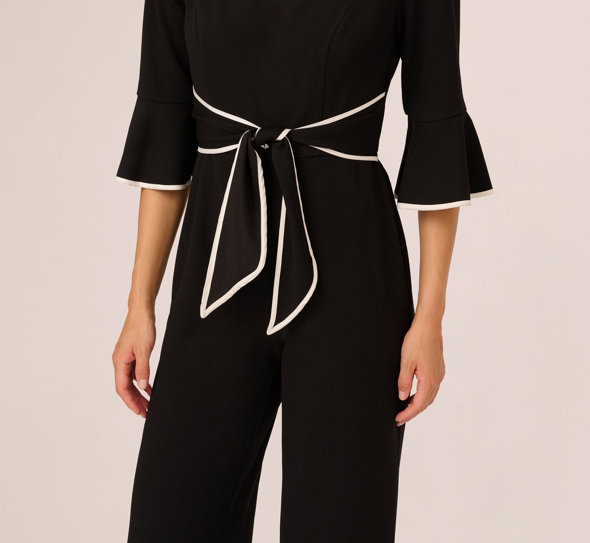 Bell Sleeve Tie Front Contrast Tipped Jumpsuit In Black Ivory