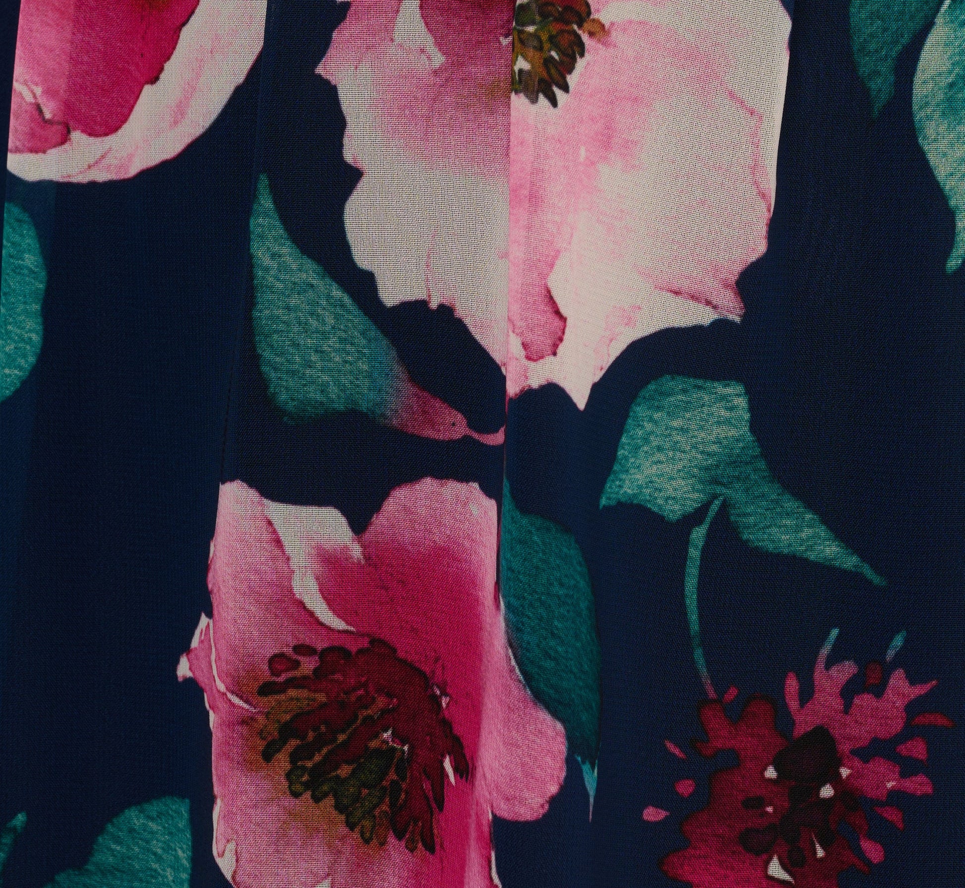Cap Sleeve Floral Chiffon A Line Midi Dress In Navy Pink Multi