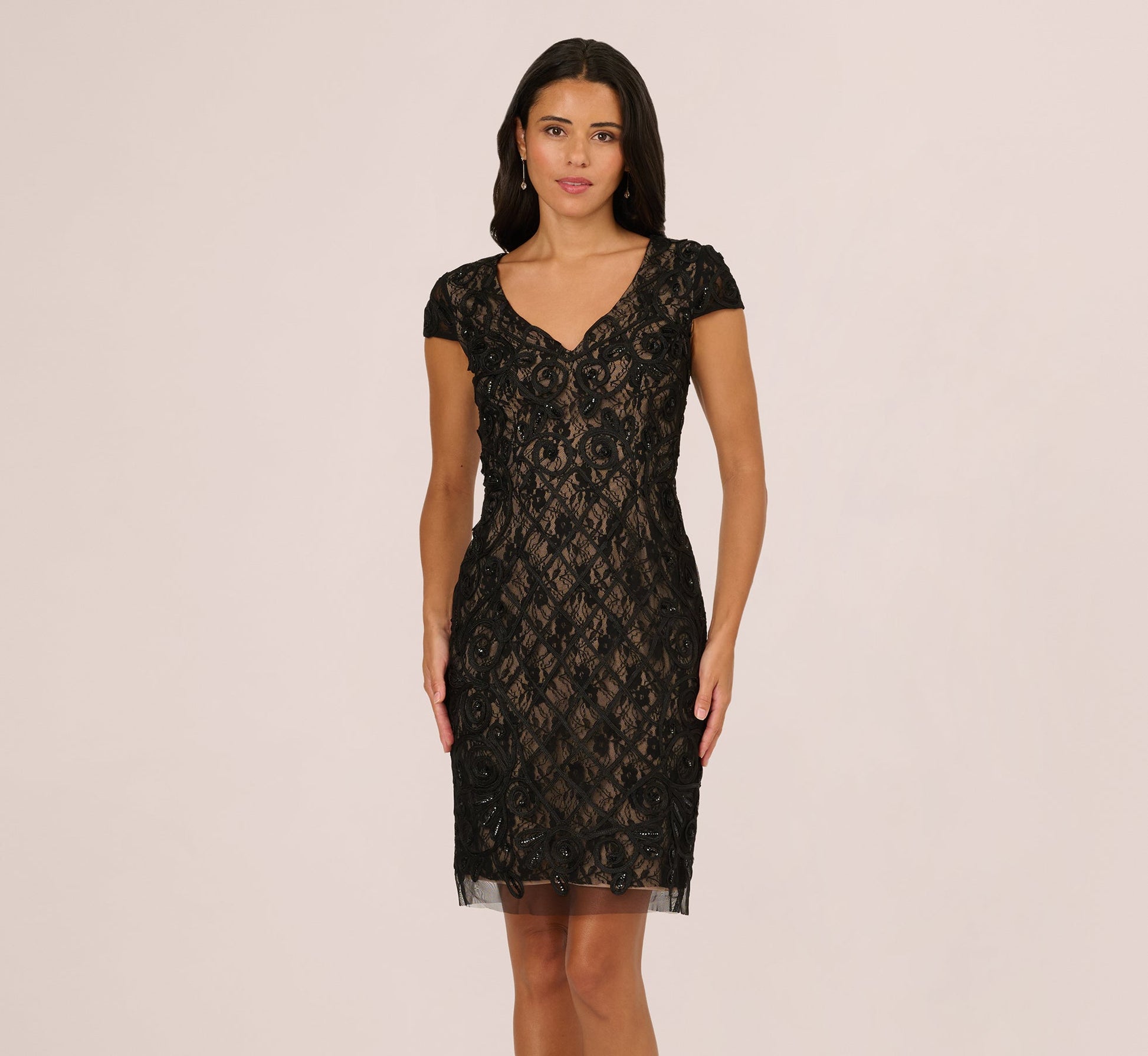 Timeless with a touch of texture, this cocktail dress is crafted from delicate lace and artfully embellished with dimensional soutache embroidery and tonal beadwork. The sheath silhouette creates definition, finishing just above the knee for a polished, evening ready look. A V neckline and cap sleeves lend classic balance to the ornate detailing, making this dress an ideal choice for cocktail receptions, weddings, or special occasions that call for elevated elegance.