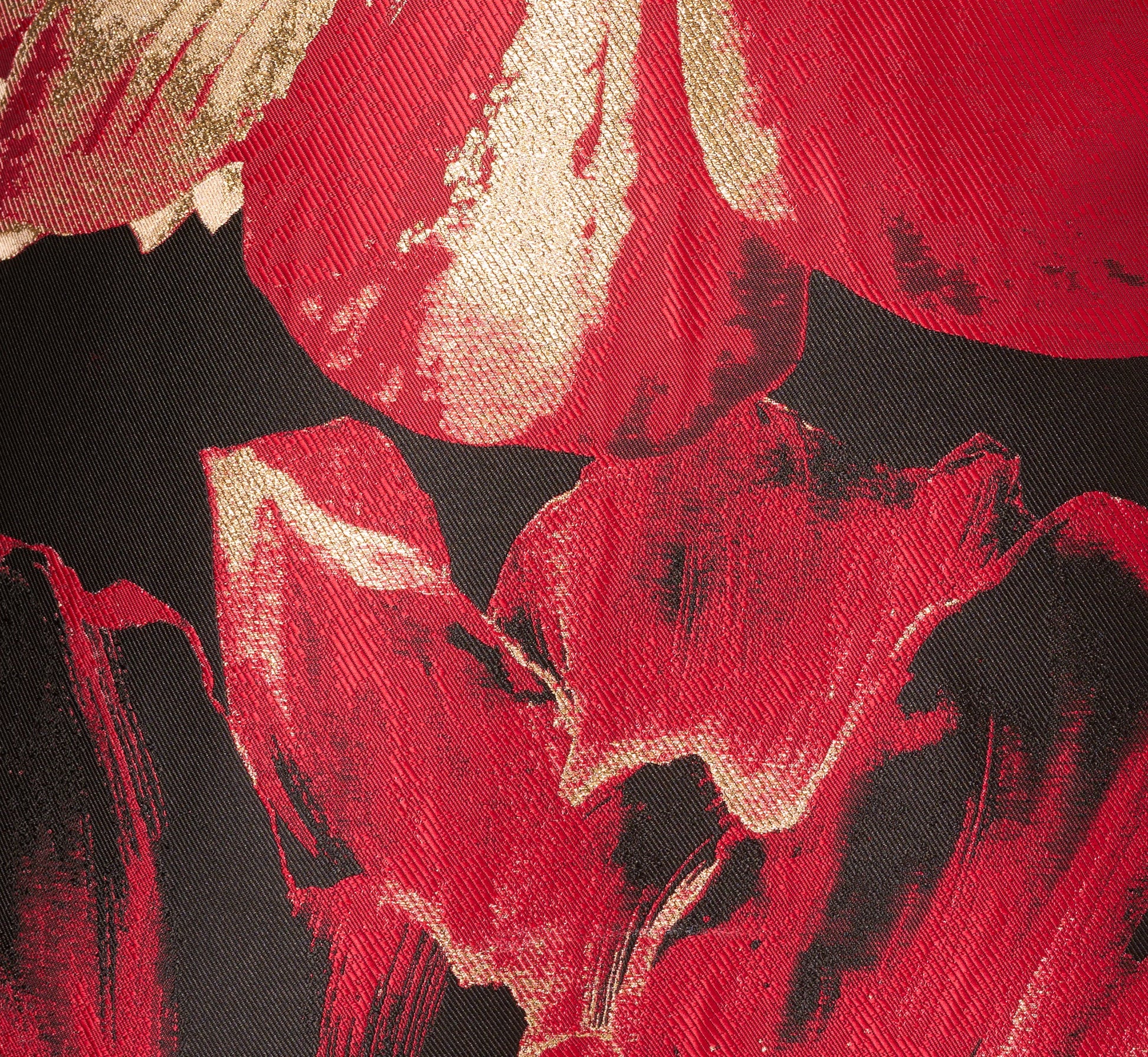This elegant gown design pairs a structured black satin bodice with a colorful floral jacquard skirt creating a clever outfit-in-one effect. The cap sleeve bodice features a notched square neck with a back zipper ensuring a fitted look. The skirt flares out in a dramatic maxi length A-line cut, complete with convenient pockets at the side.