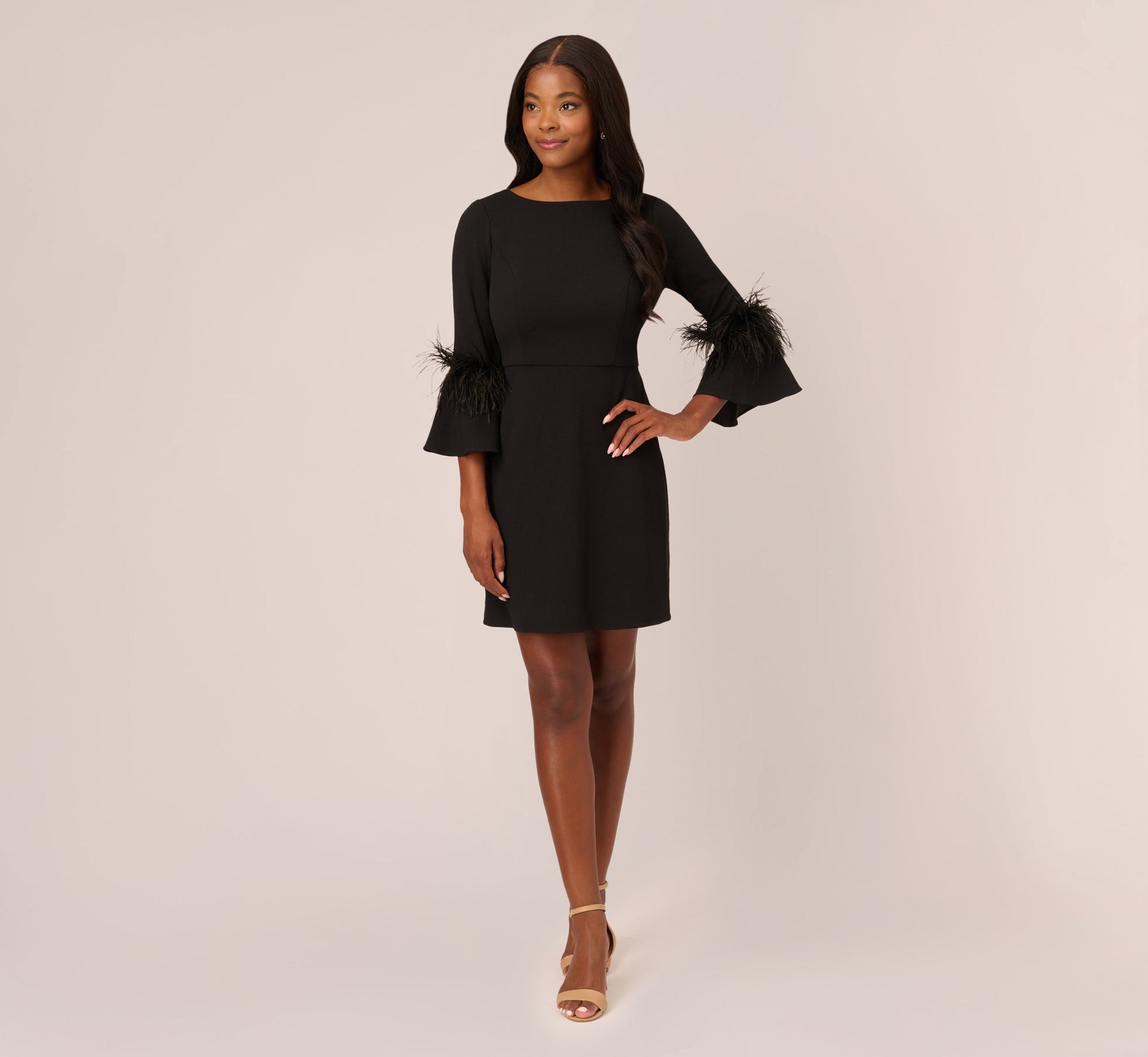 Trendy touches make this otherwise timeless dress a pretty look. This A-line dress features a boat neckline, three-quarter length bell sleeves, and feather trim at the cuffs. Crafted from a stretch crepe fabric, this dress is a comfortable look for cocktail parties and weddings. Adornedwith a bow at the back waist and a zipper closure, this party dress is a cute look. Styled with nude heels and a simple clutch, this feather dress will stand out.