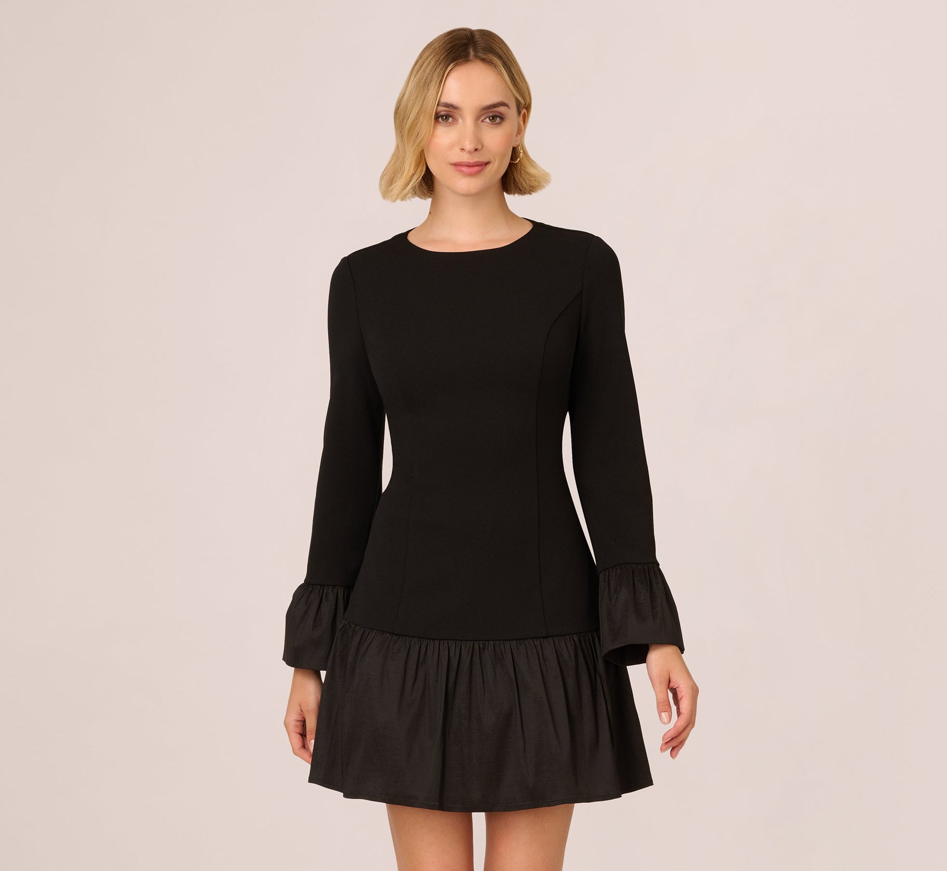 For a classic and wearable approach to the drop waist trend, this long sleeve mini dress uses knit crepe fabric for comfortable figure-skimming stretch in the body and sleeves. Delicate but structured taffeta ruffles finish the skirt and cuffs. This easy back zip design creates aninstantly pretty and refined look. The crew neck and long sleeves contrast with the above-the-knee hemline for a balanced silhouette.