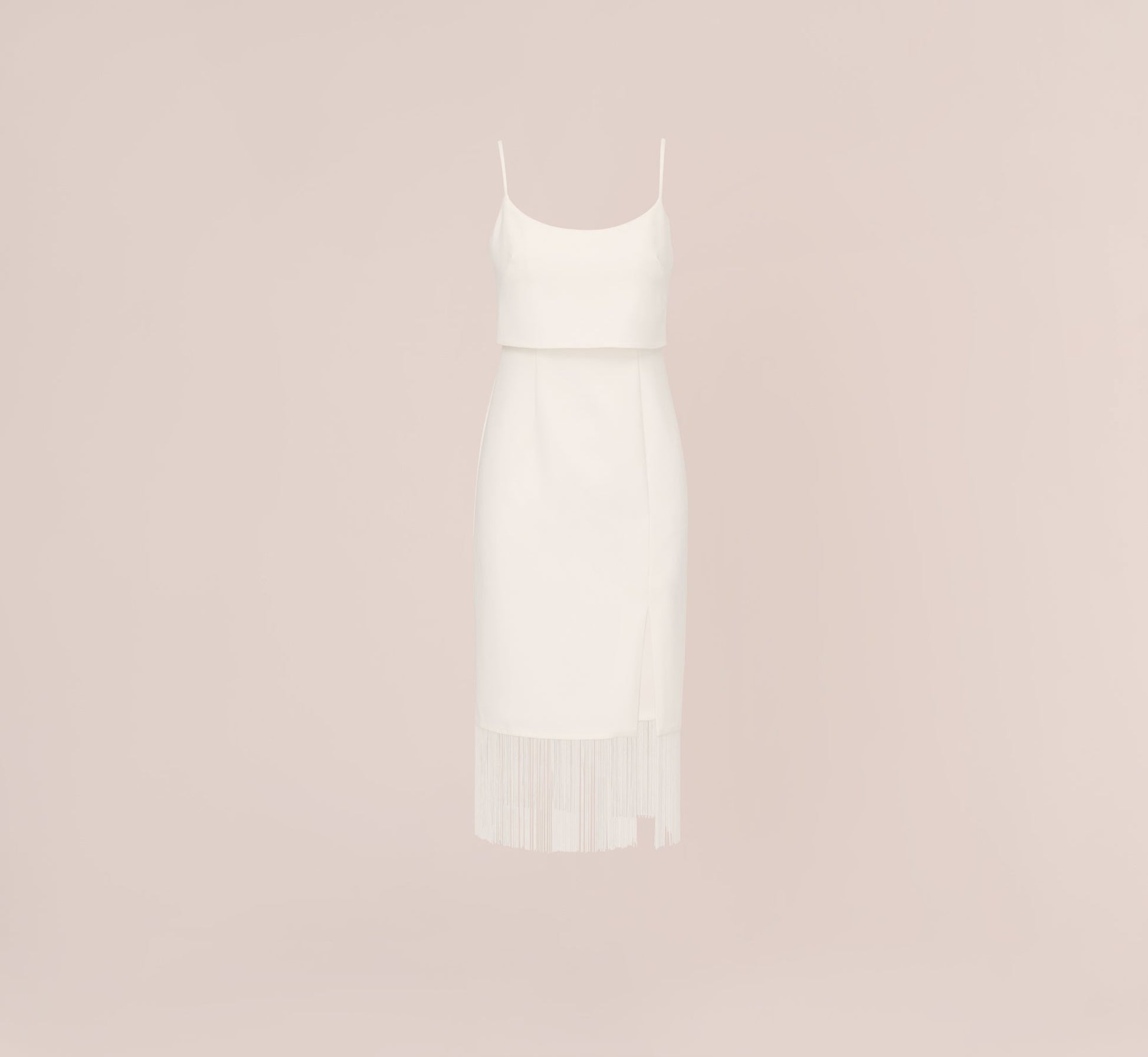 This simple sheath dress is anything but thanks to a mix of classic and trendy details. This cocktail dress features a scoop neckline, adjustable spaghetti straps, and a fitted skirt adorned with fringe. Crafted from crepe fabric, this dress has slight stretch. A popover design adds a unique touch to the bodice. A zipper closure completes this midi dress. Paired with a nude heel and statement earrings, this dress is ready for a night out.
