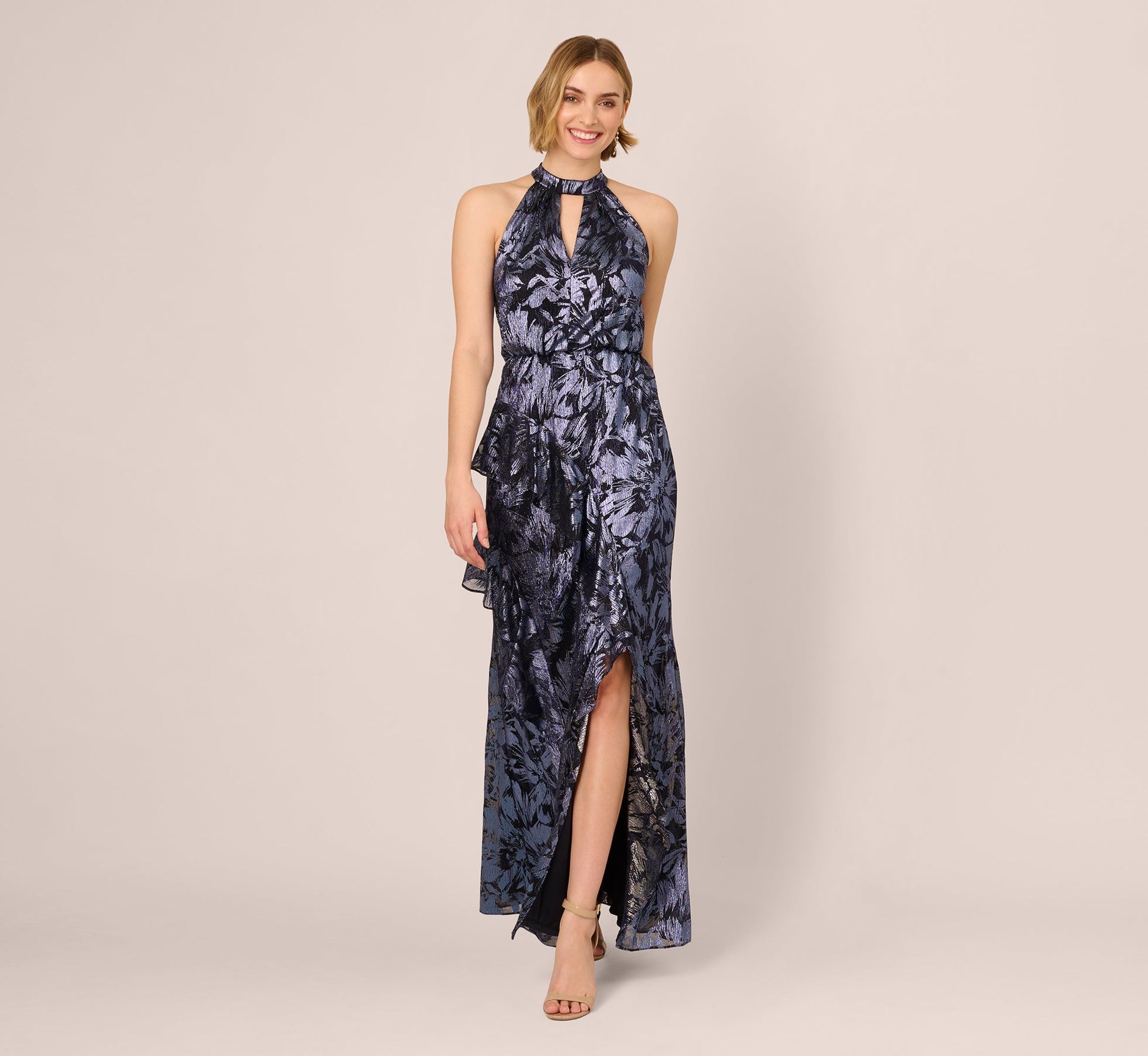 Elegant lines pair with shimmering modern texture in this mermaid gown design, crafted from metallic crinkle fabric with a botanical inspired tonal print. The keyhole halter neckline with a band collar adds a touch of drama, while the blouson waist creates an effortless fit. Cascading ruffles down the skirt enhance the gown's fluid movement and a back zipper closure ensures the perfect fit. You'll make a glam statement at any formal event in this luxe evening dress.