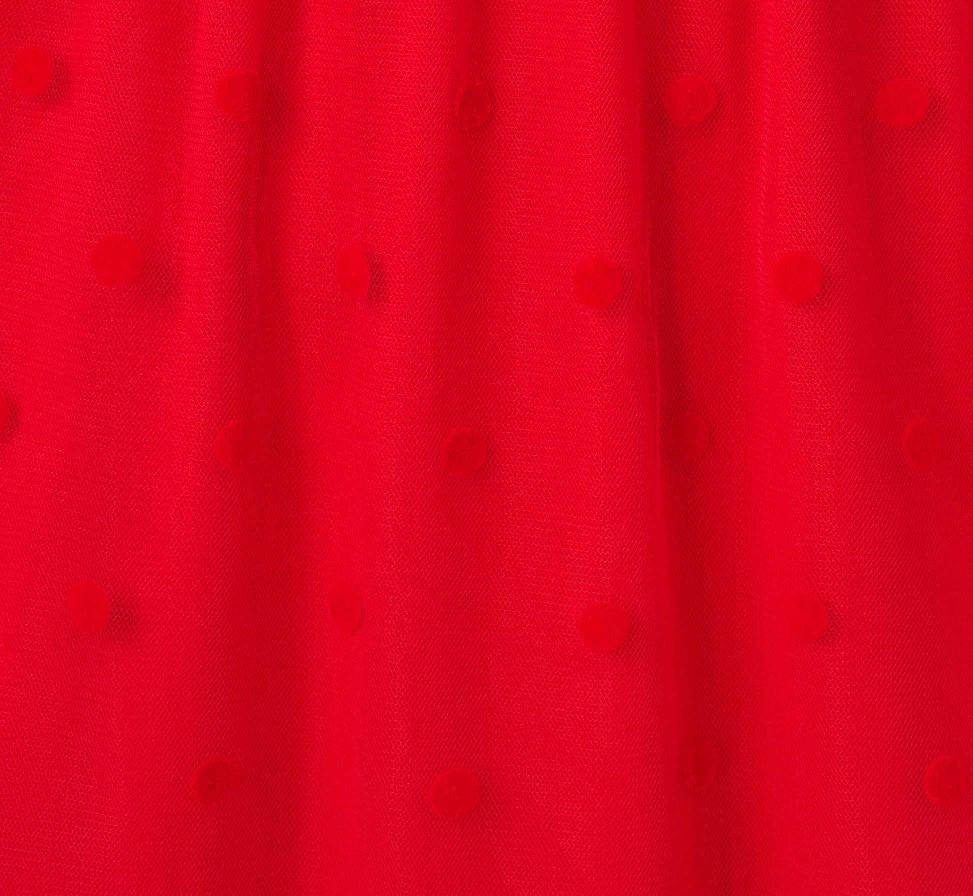 A monochrome polka dot tulle overlay adds both texture and structure to this bright red midi dress. The V-neck and V-back are trimmed with a wide ruffle, creating a sheer cap sleeve over the shoulder. The waist is defined with a side zipper and stretch smocking, falling into an A-line tea length flounce hem skirt. Bold and fun but still super wearable, this dress is perfect for parties and special occasions.
