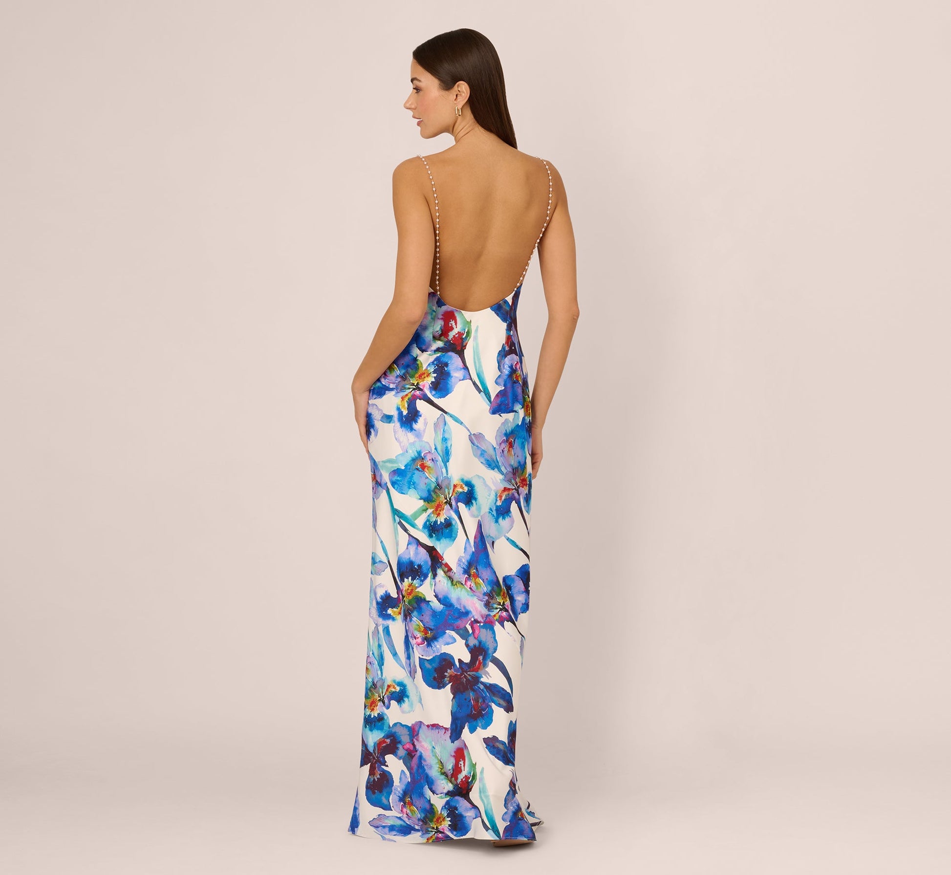 Effortlessly elegant, this slip dress drapes beautifully in fluid watercolor floral satin. The cowl neck creates soft, graceful lines, complemented by delicate faux pearl chain straps that add a luxe touch. A stunning open back enhances its glamorous feel, while the side zipper closure ensures a seamless fit. Perfect for special occasions, this dress combines artistic beauty with timeless sophistication.