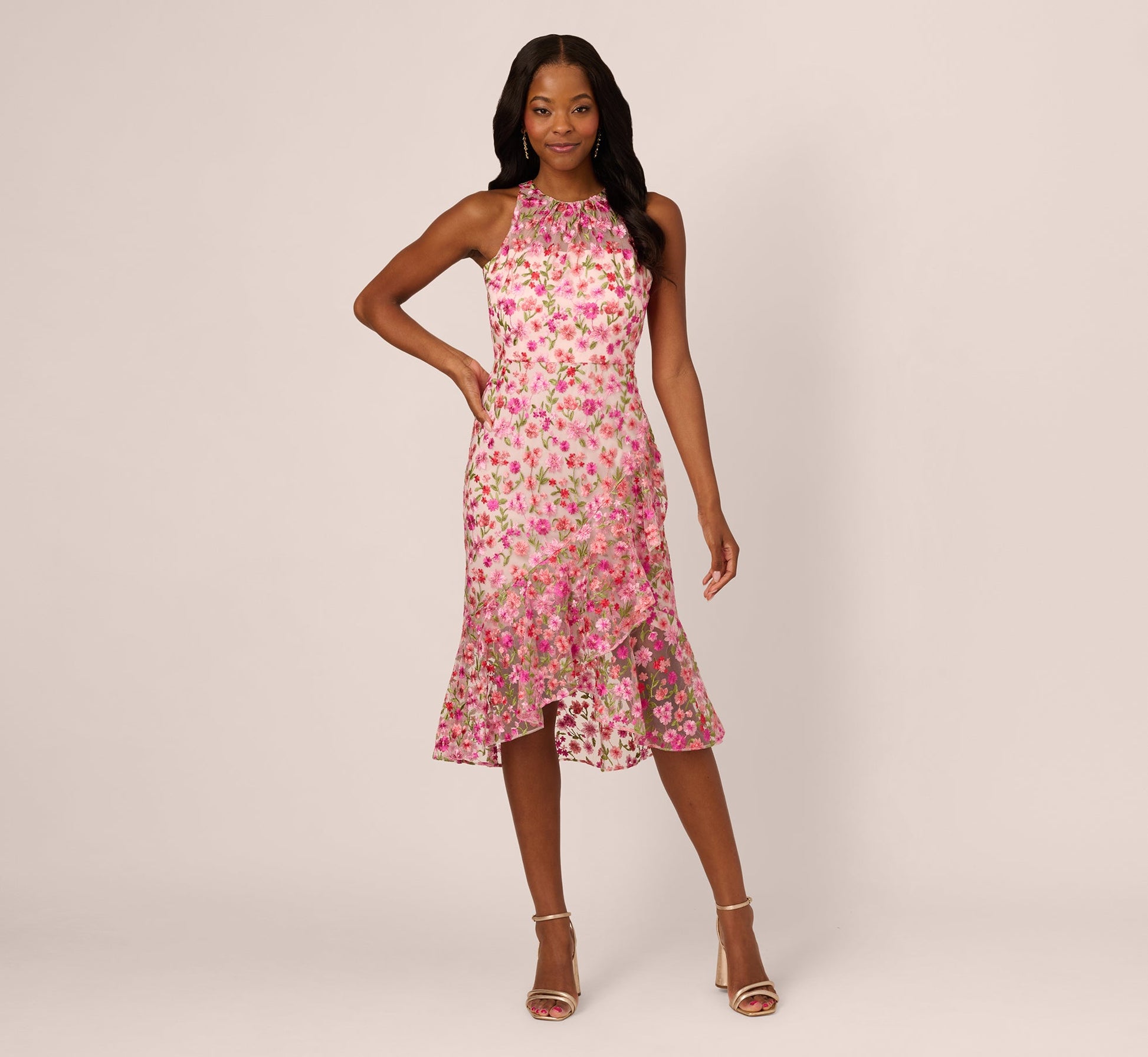 Delicate floral embroidery on a sheer mesh overlay gives this pretty pink midi dress soft texture. The illusion neckline highlights the halter neck with a gathered collar adding dimension to the design. The sheath silhouette is accented with a flounced tulip skirt for a touch of romantic charm. A back zipper closure completes the look. Perfect for garden parties, dinners, and cocktail dress codes, this dress is made for celebrating.