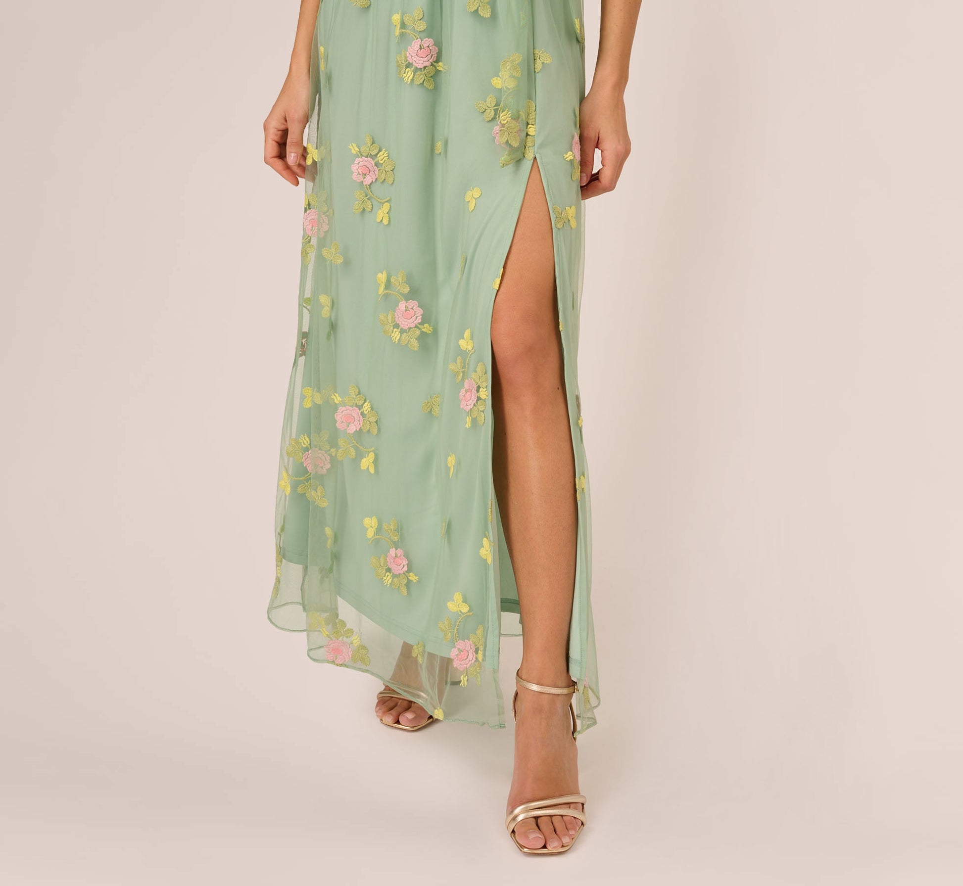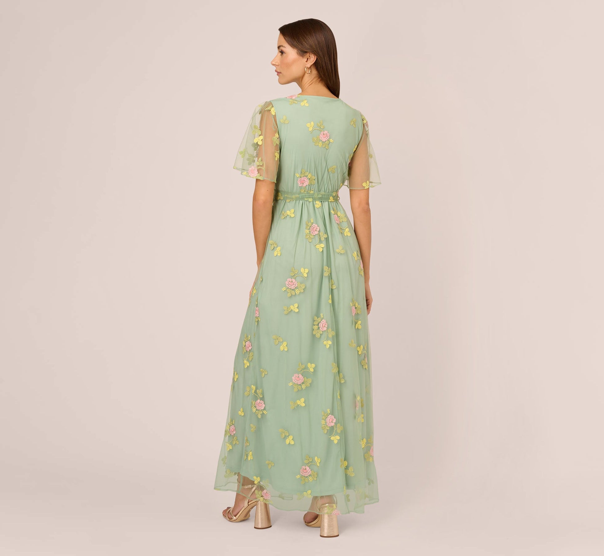 Floral Embroidered Maxi Dress With Sheer Flutter Sleeves In Sage Multi