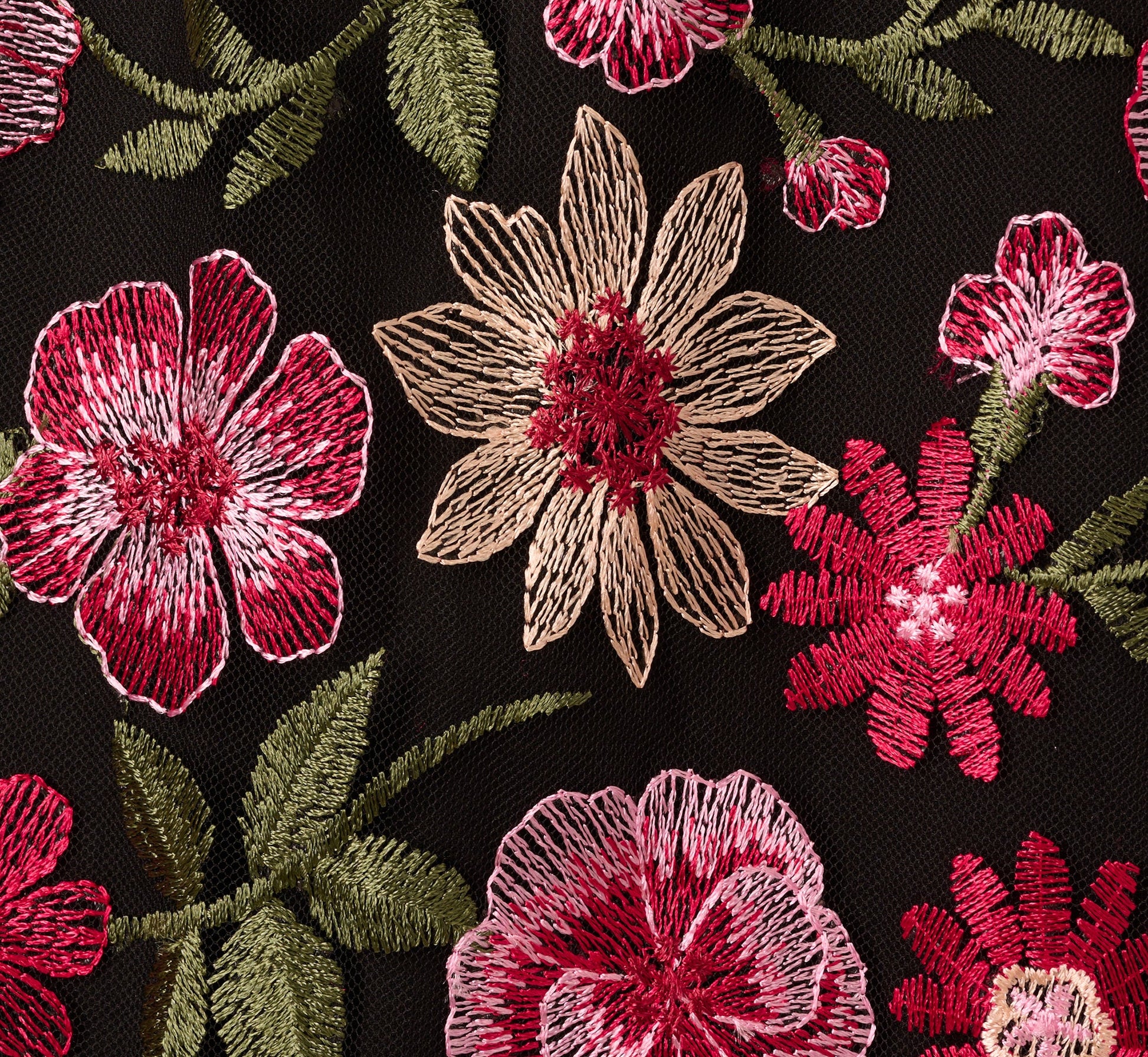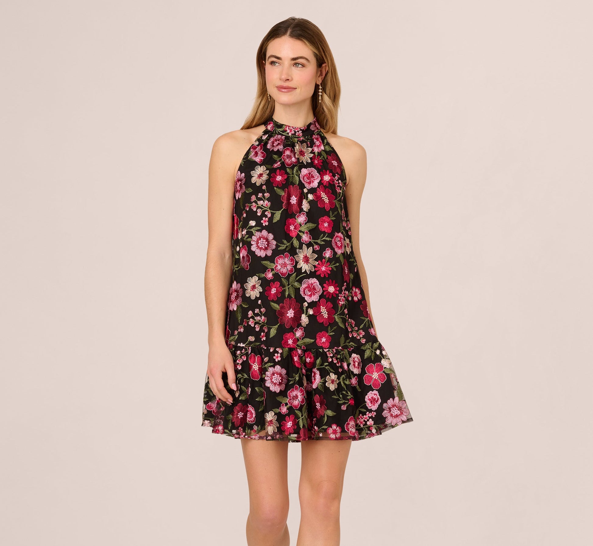 Intricate floral embroidery adds sweet and soft texture to this breezy trapeze dress. The flounce hem skirt highlights the flowy silhouette and the halter collar is finished with a button closure over the keyhole back. This cute little number is a garden party in a dress, perfect for a day out with your family or brunch with the girls.