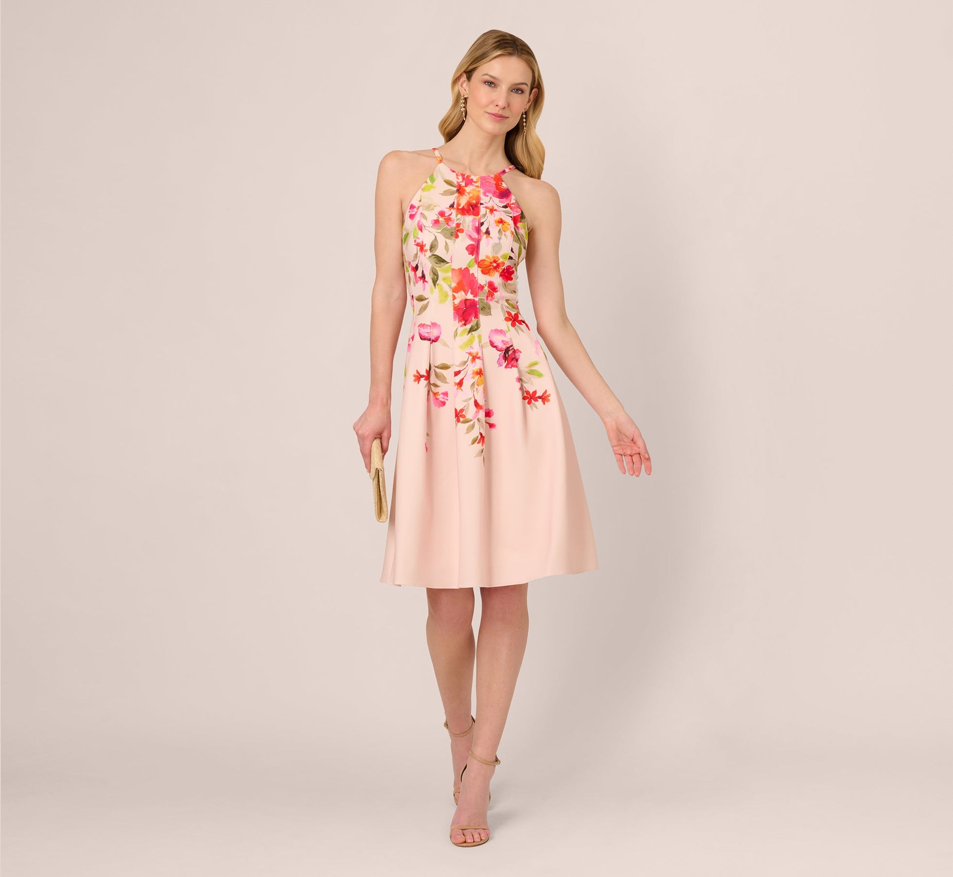 This sunny knee length dress is crafted in stretch twill for a soft but structured drape. The floral design cascades from the halter neckline over the hips and down the skirt. Vertical corset inspired seams give the bodice a fitted look with pleats at the waist creating a flared silhouette. A back zipper closure completes the design. Bright and colorful yet utterly sophisticated, this dress will be your new favorite for parties and festive events.