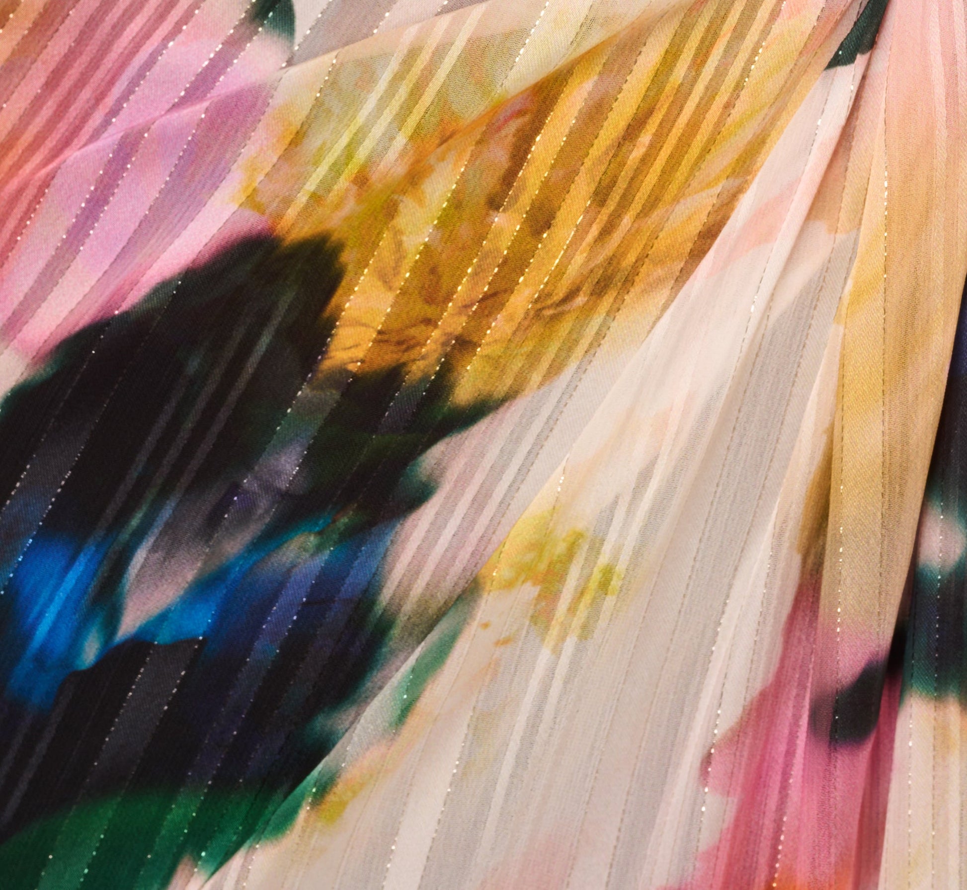 Modern texture and print lend themselves to this classic chiffon gown. This evening gown features a one shoulder neckline, fitted bodice, and flowing skirt. A knotted detail at the waist accentuates the wearer's figure and creates a draped effect down the skirt. Fully lined, this gown is crafted from a floral print chiffon fabric with a mini-pleat textured look. A side zipper closure completes this one shoulder gown. This floral formal dress is an elegant choice when styled with nude heels and a velvet clutch.