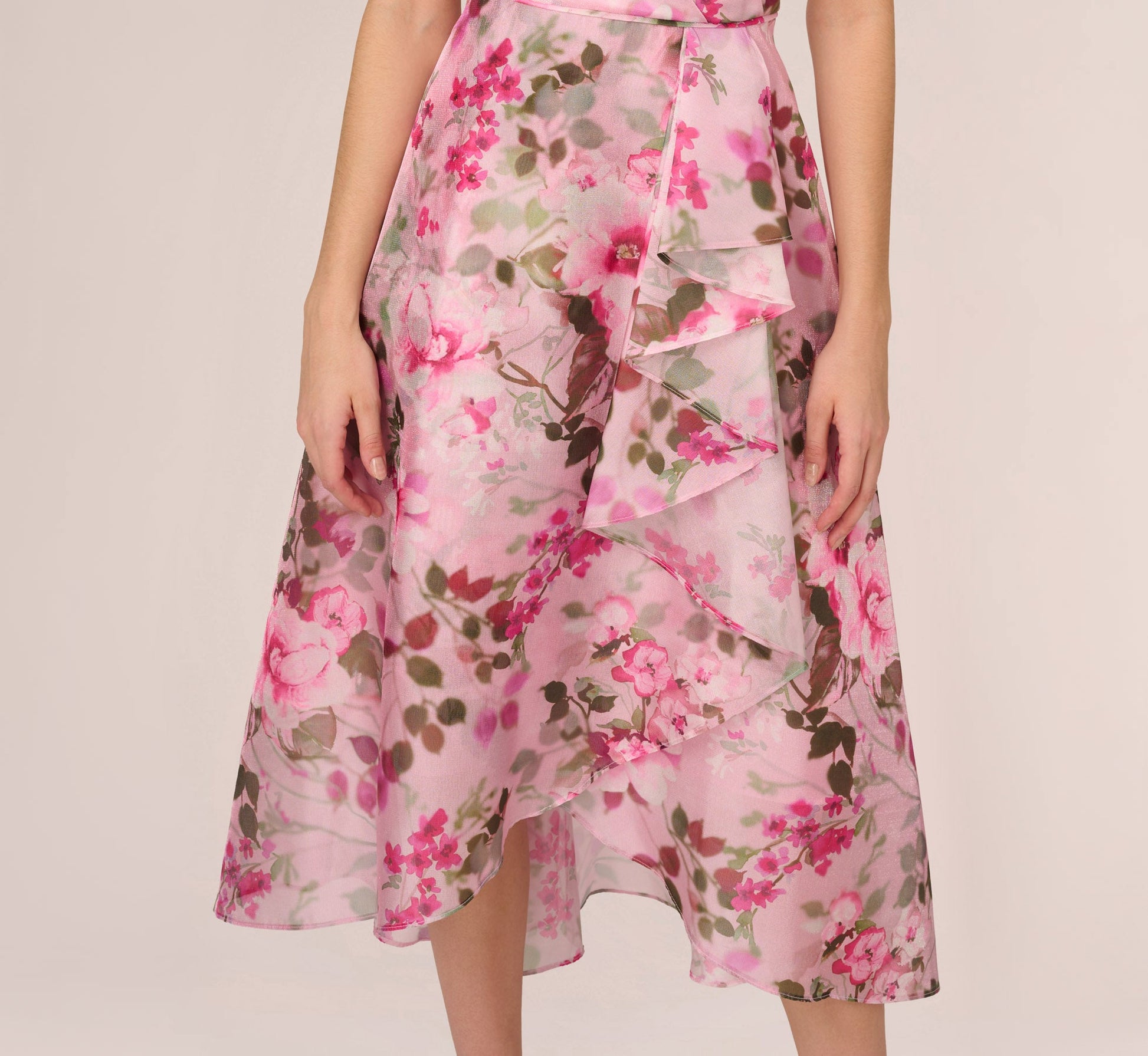 Fall for layers of delightful print when you add this floral dress as your new plus one. This formal dress features a one shoulder bodice with draped details, a high-laux faux wrap skirt, and ruffle trim that begins at the waist. Made from floral print organza fabric, this midi dress has a piped waist seam and little stretch. A zipper closure at the center back completes this party dress. Styled with nude heels and a rattan clutch, this dress will shine for any dressy occasion.