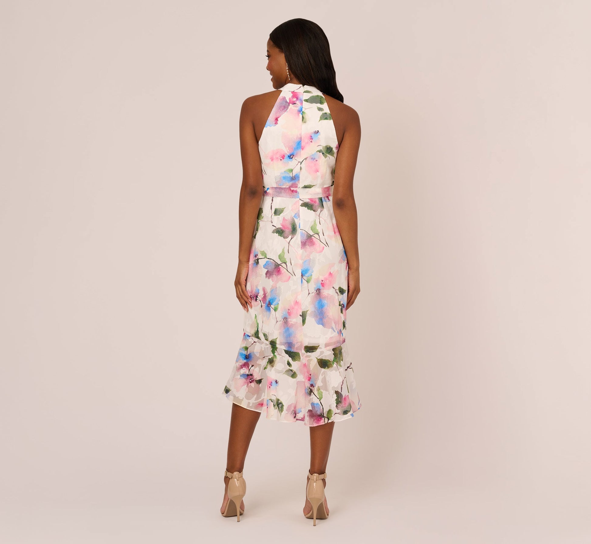 Dreamy painterly florals adorn this romantic halter dress. This sleeveless dress features a halter bodice with surplice neckline, flounce skirt with high low hem, and a self-tie sash at the waist. Crafted from chiffon fabric with a watercolor floral print, this dress is detailed with shirred detailsand ruffles throughout the design. A hidden zipper closure at the center back completes this midi dress, which has minimal stretch. This floral dress is ideal for any occasion from a day out to a destination wedding with the right accessories.