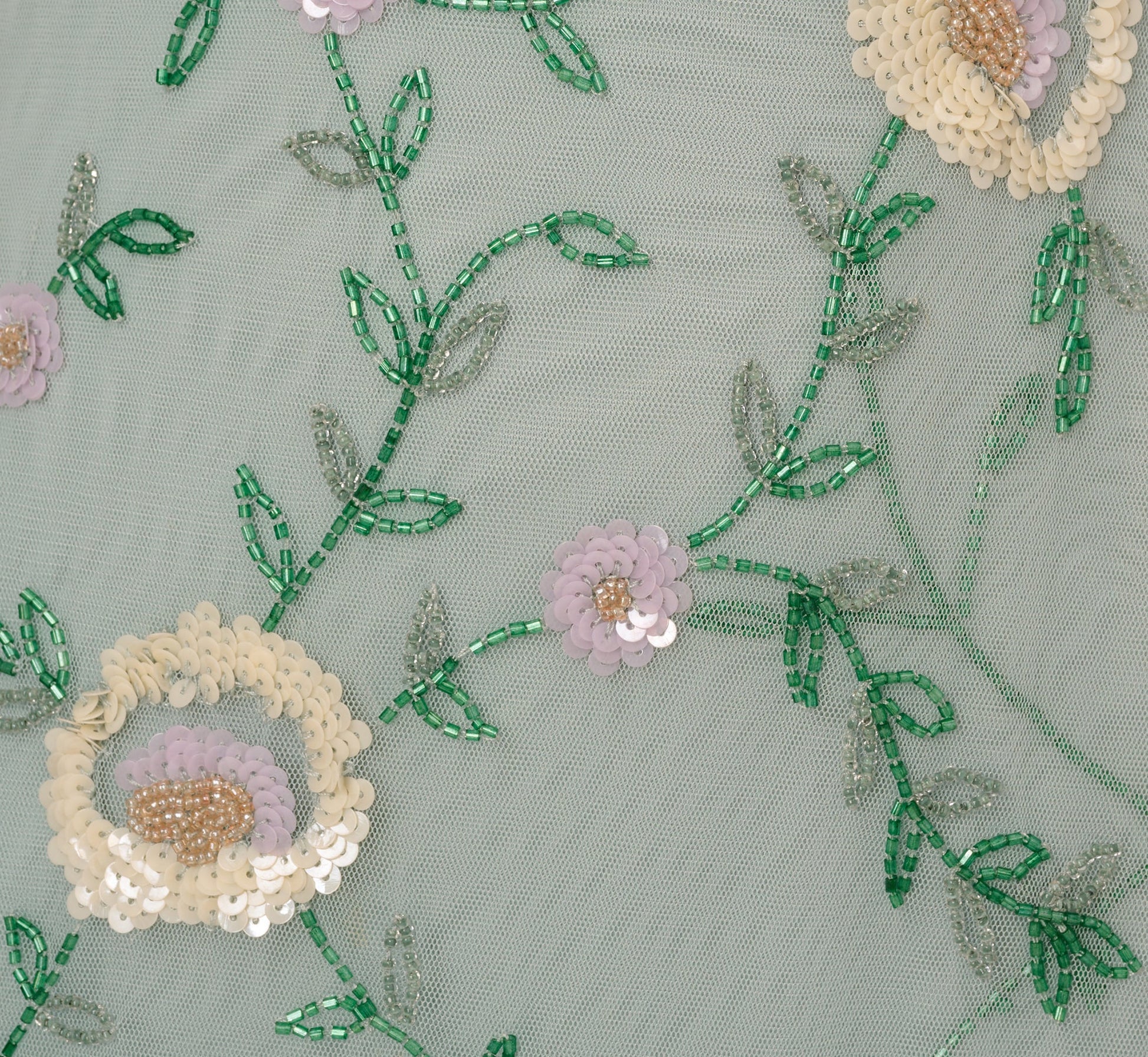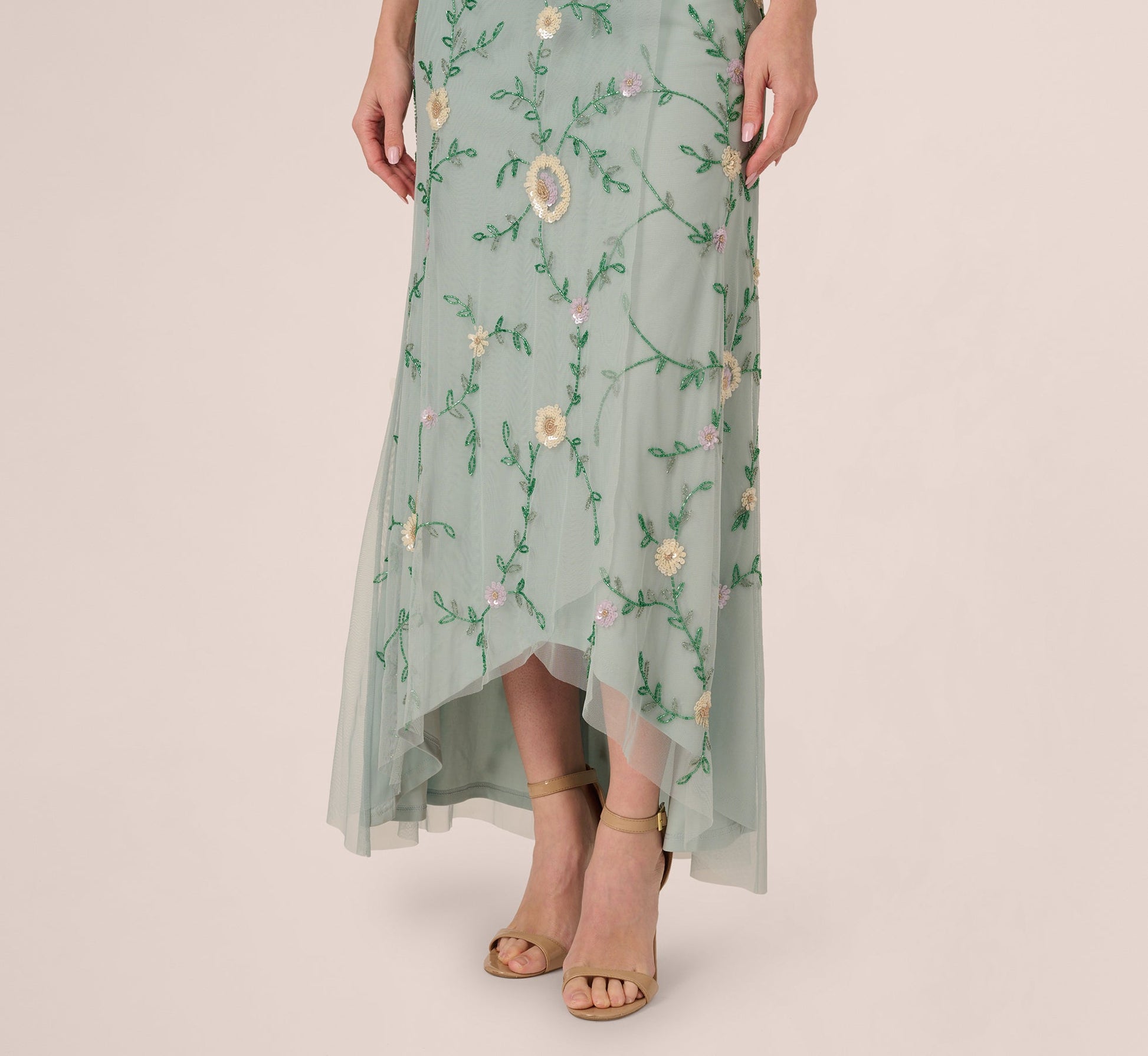 Timeless elegance meets floral romance in this gorgeous minty green flutter sleeve gown. A faux wrap design gives the dress a surplice neckline and a subtle high-low hem. Colorful hand-applied beading and sequins give this dress a touch of sparkle. Wear this shimmery dress for a sophisticated formal look with a sweet and charming finish.