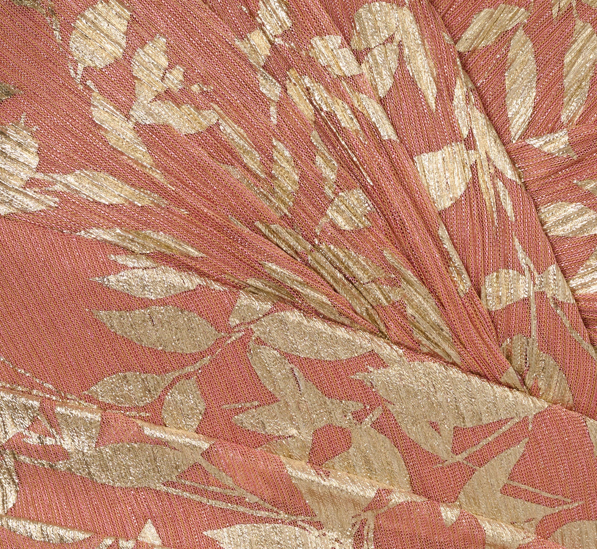 Flutter Sleeve Draped Foil Leaf Midi Dress In Coral Gold