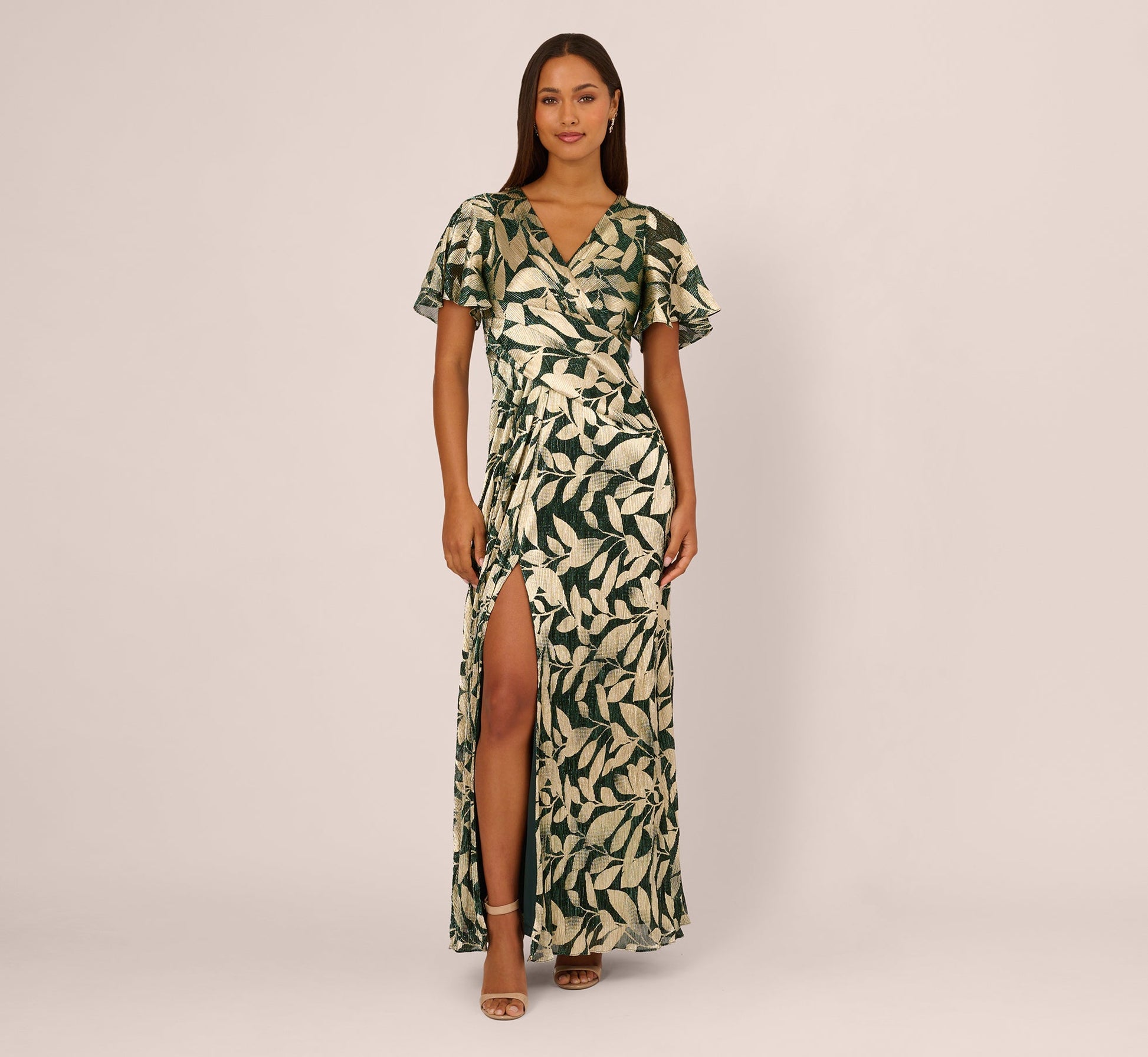 Natural details meet sparkle in this elegant draped gown. This formal dress features a v-neckline, surplice bodice, flutter short sleeves, and a floor-length soft skirt. Soft draping at the waist and skirt accentuates the wearer's figure. Crafted from crinkle foiled leaf fabric, thisevening gown shines on a formal or black-tie night out. A slit at the side of the skirt and a zipper closure at the center back completes this metallic dress. Styled with nude high heels and a contrast clutch, this short sleeve gown will be a hit on the red carpet.