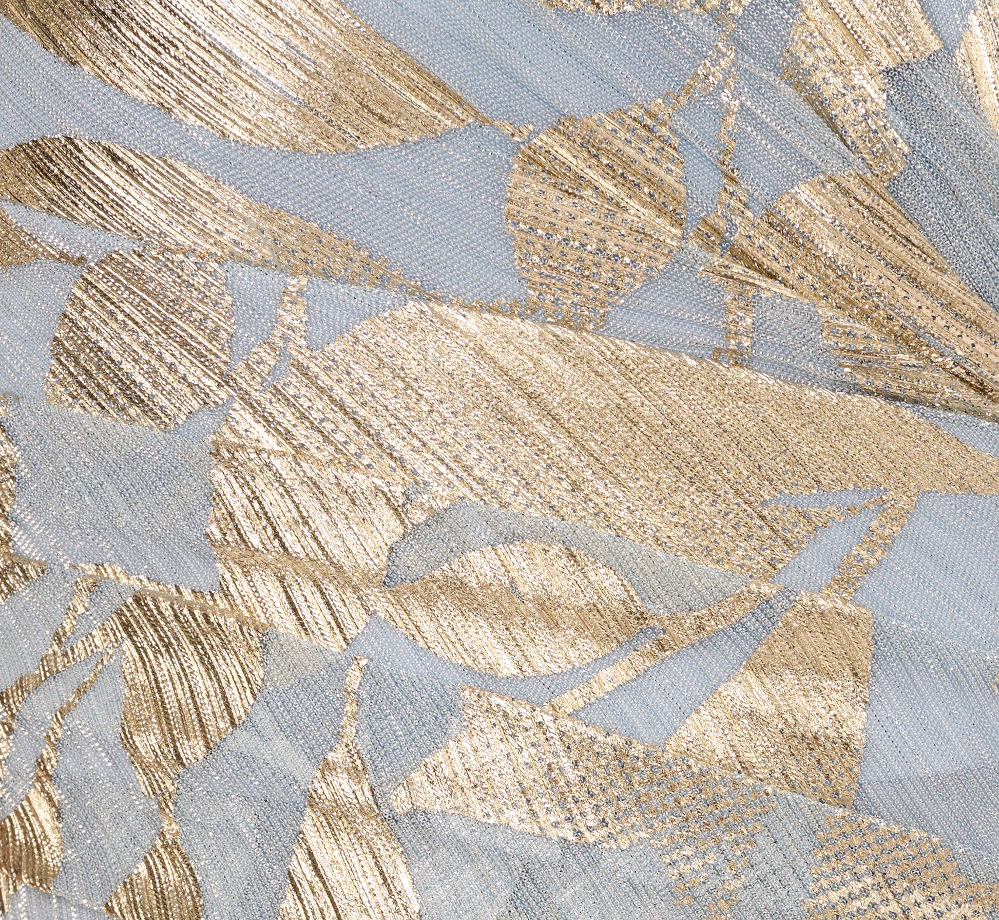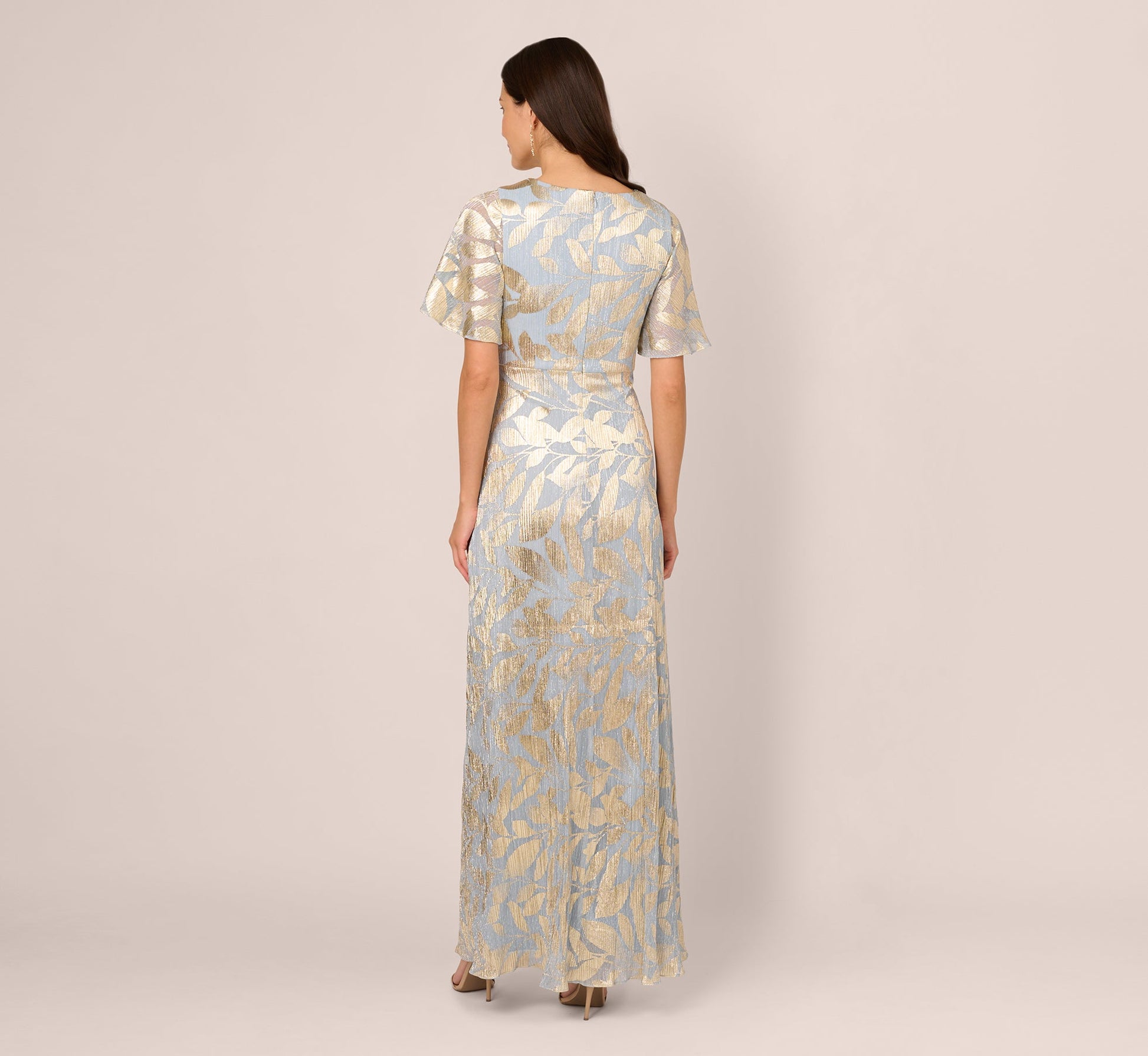 Foil Leaf Short Sleeve Gown With Draped Details In Light Blue Gold