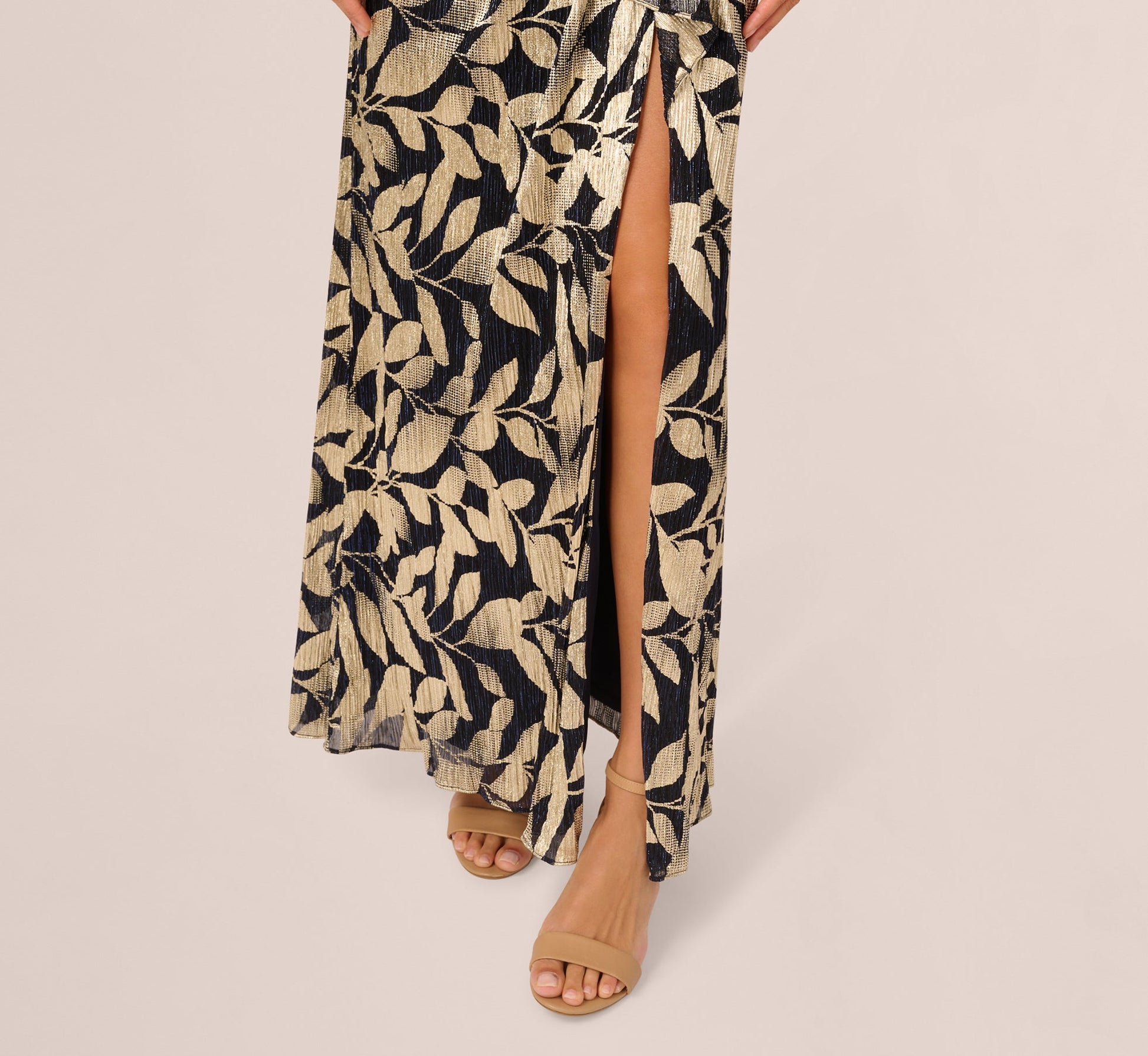 Take your style to the next level with this edgy foiled dress. This formal dress features an asymmetrical neckline, draped details through the body, and ruffle trim at the waist. Crafted from foiled and printed novelty fabric, this sleeveless dress is an eye-catching look with some stretch.A slit at the side of the mermaid skirt and a side zipper closure complete this evening gown. Paired with nude heels and a simple clutch, this printed gown is a charming look.