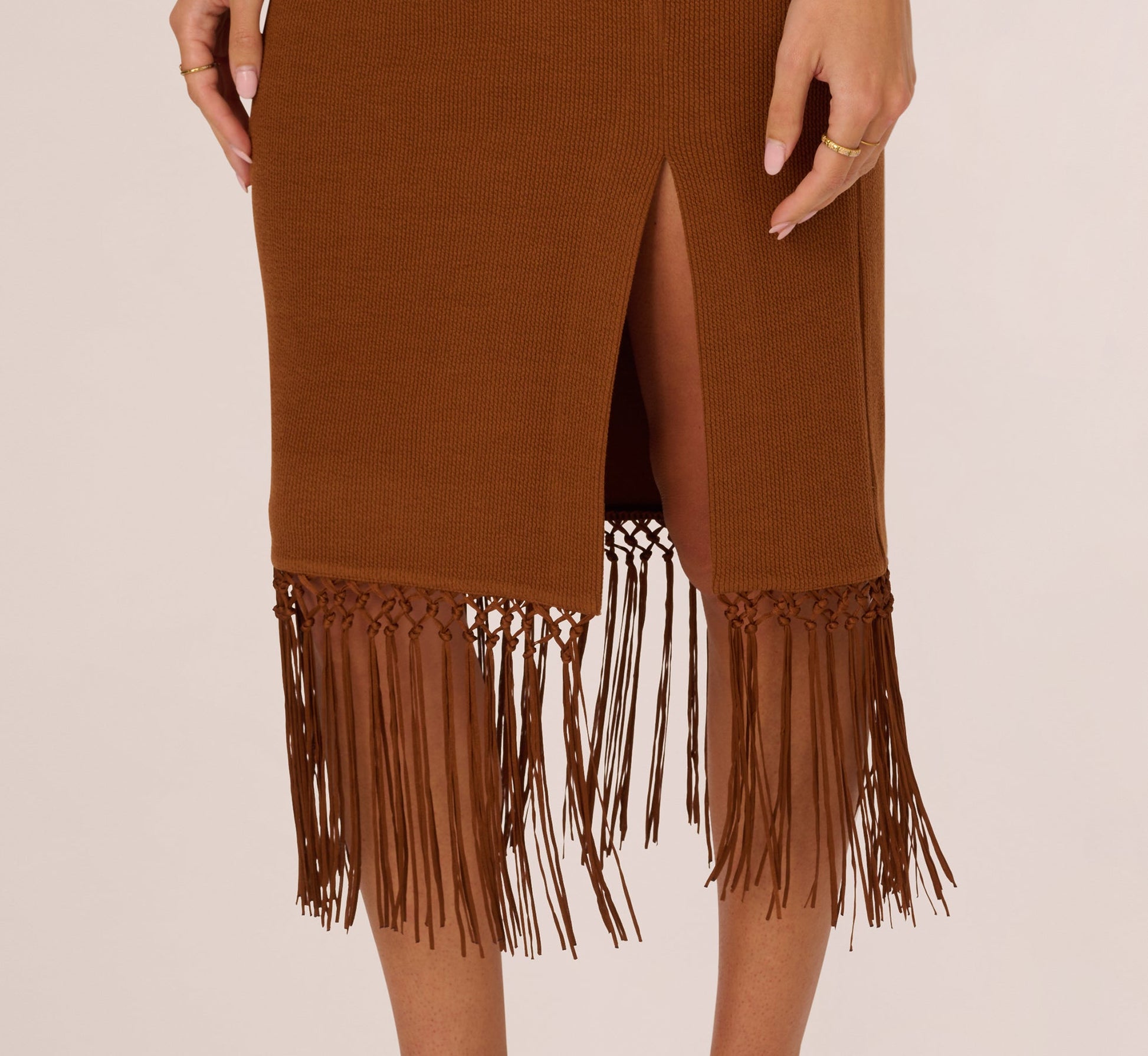 Trend-forward yet timeless, this fringe midi dress is a beautiful design. This cute dress features a sweetheart neckline, empire waist, tank straps, and a fringe midi skirt. Designed with a ribbed knit fabric, this fitted dress has a lot of stretch, making it a comfortable fit for most body types.With a slit at the side of the skirt and shirring at the bust - which has a bow appearance- this midi dress is a versatile look for casual and dressy events. A zipper closure at the center back completes this sleeveless dress. Styled with neutral or metallic accessories, this fringe dress isa boho look.