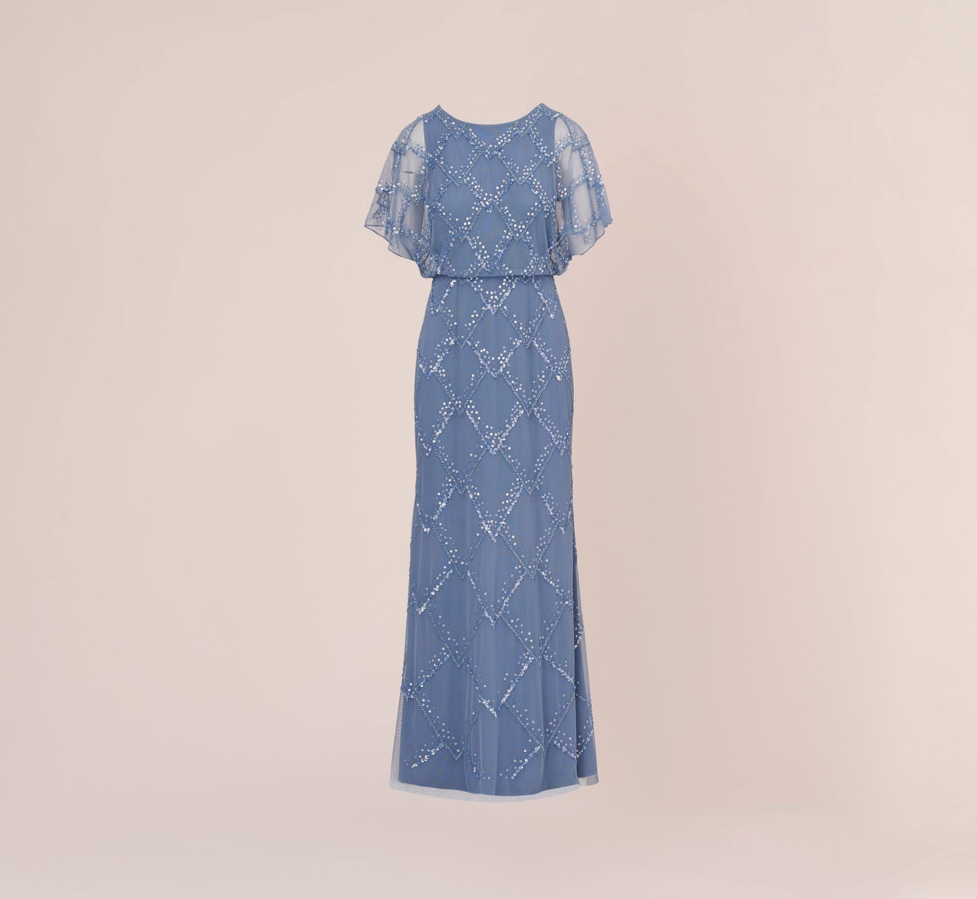 Hand-Beaded Blouson Long Gown With Flutter Sleeves In French Blue