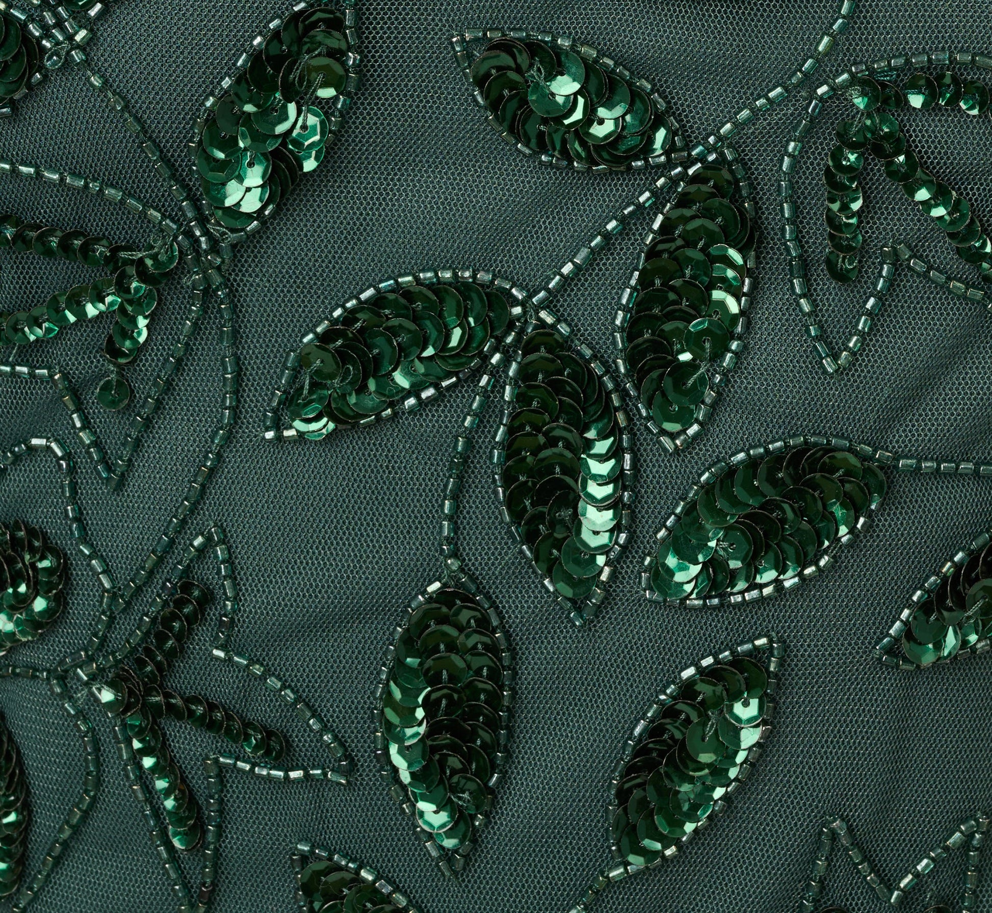 Hand Beaded Short Sleeve Floral Godet Gown In Dusty Emerald
