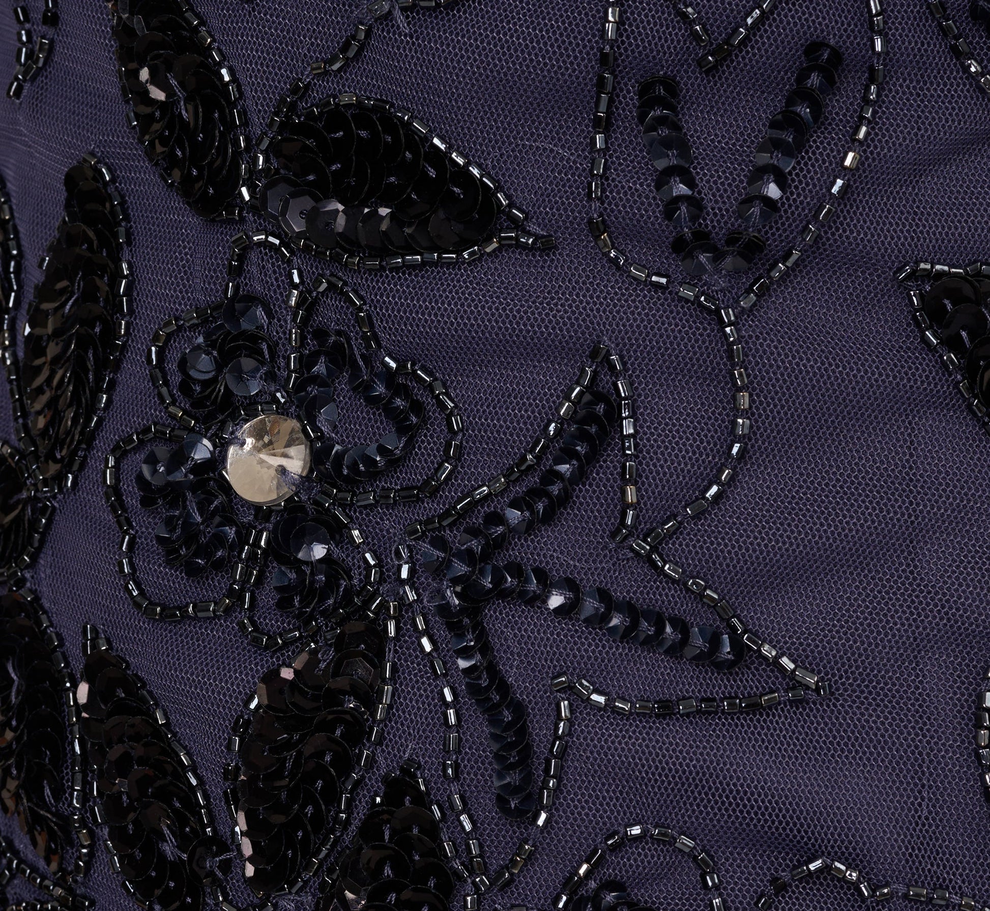 A work of art: our long and romantic gown dazzles with allover handsewn beading in a feminine floral pattern that catches the light with every twirl. A streamlined silhouette is eased with the mermaid skirt with godets to create the right amount of movement. All the details: our iconic (and flattering) no waist seam, sheer illusion yoke and cap sleeves. Sleek back zip closure.
