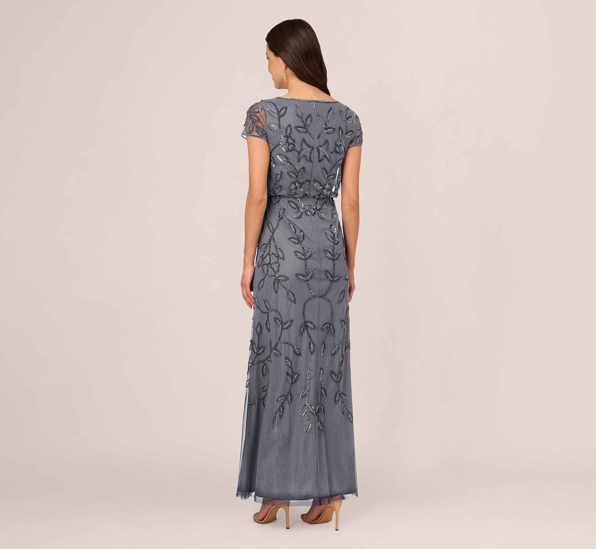 Being the best-dressed guest is easy with this short sleeve beaded gown in your arsenal. This formal dress features a bead-trimmed boat neckline, sheer short sleeves, a blouson bodice, and a mermaid skirt. Lined through the body, this evening gown is overlaid in mesh fabric that is covered in sweet jasmine floral beading. An elastic blouson waistband gives this dress an easy fit. A zipper closure at the back of the gown completes the design. Styled with neutral shoes and accessories, this gown is a sparkling look for bridesmaids, wedding guests, and gala-attendees.