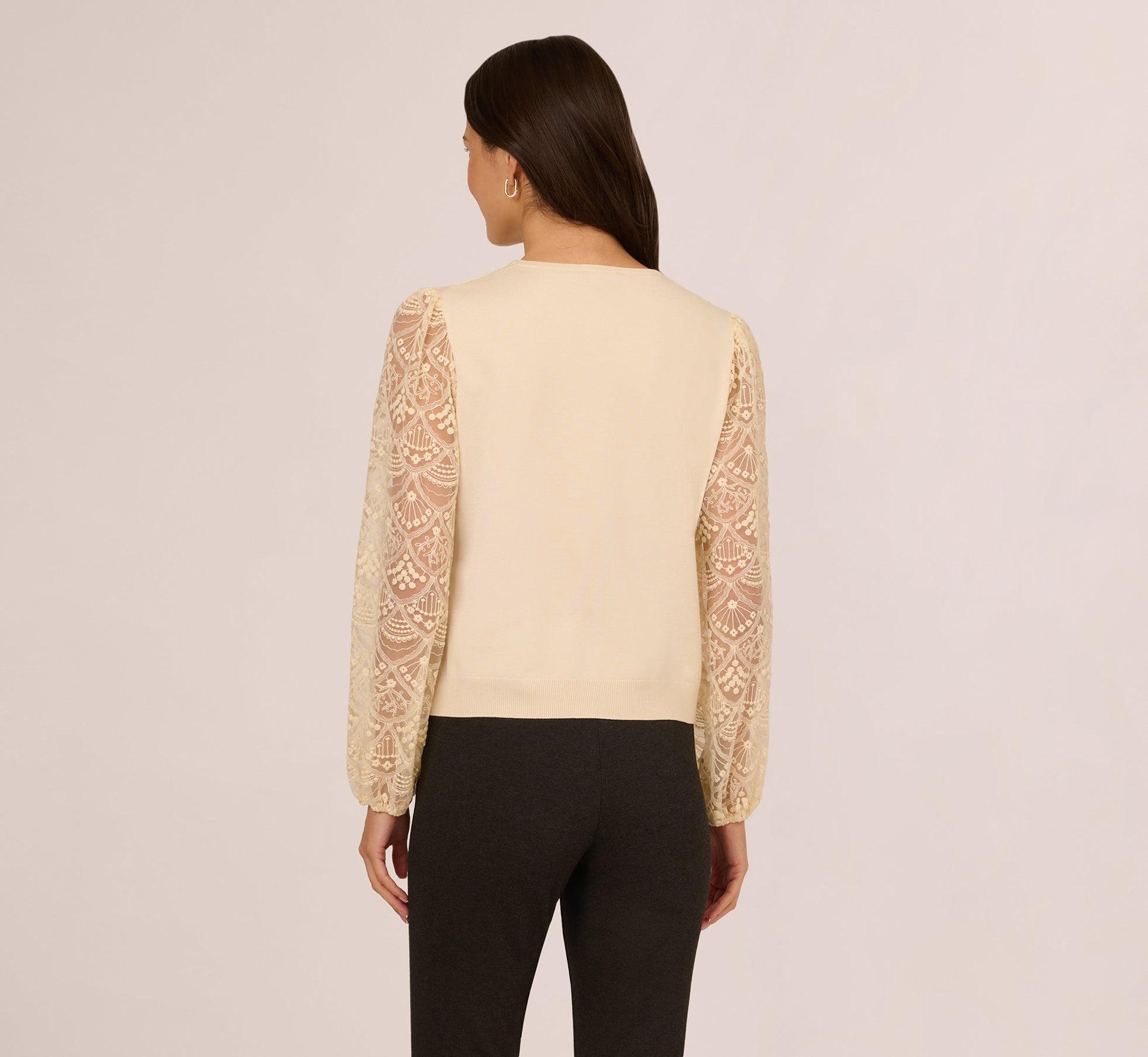 Experience effortless elegance with this polished crew neck sweater. This pullover features sheer lace bishop sleeves to add both textural contrast and soft romance to the look. Elevate your wardrobe with this versatile top that's as easy to pair with jeans as with a silk skirt and heels.