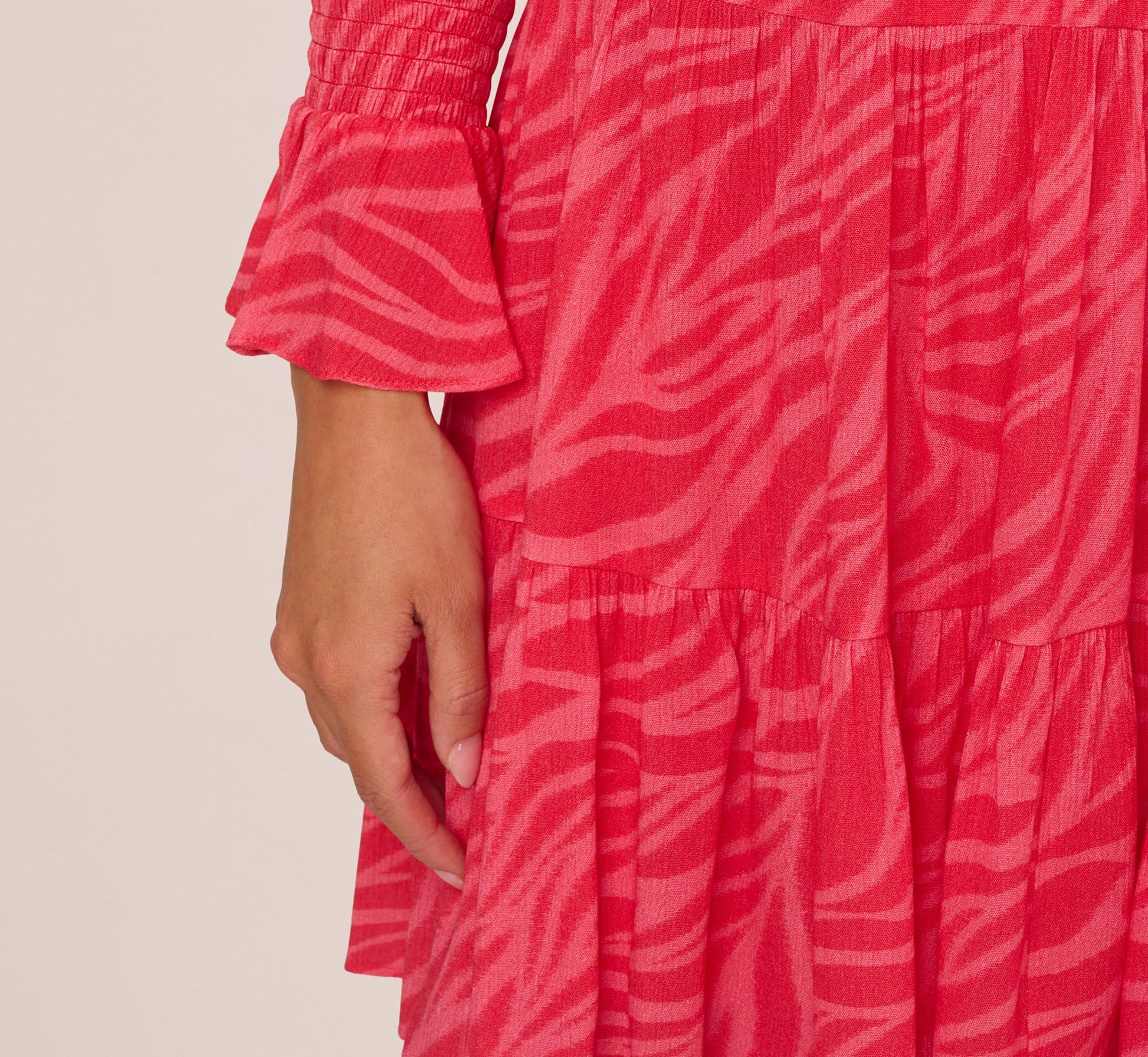 Leaf Print Tiered Shift Dress With Long Bell Sleeves In Pink Multi