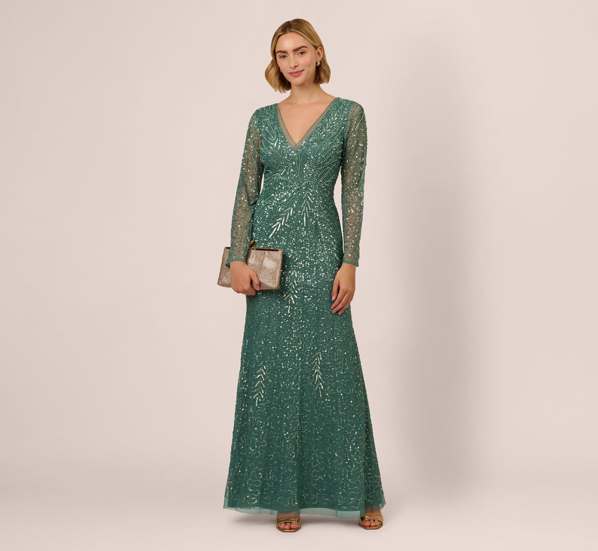 This gorgeous green gown catches the light with every movement thanks to sparkling allover beading and sequins. The mermaid silhouette design is fitted through the hips with a back zipper closure and the skirt flares from the knee for a flowing effect. Sheer long sleeves and a wide V-neck complete the look for an opulent evening dress that's both luxe and extremely wearable.