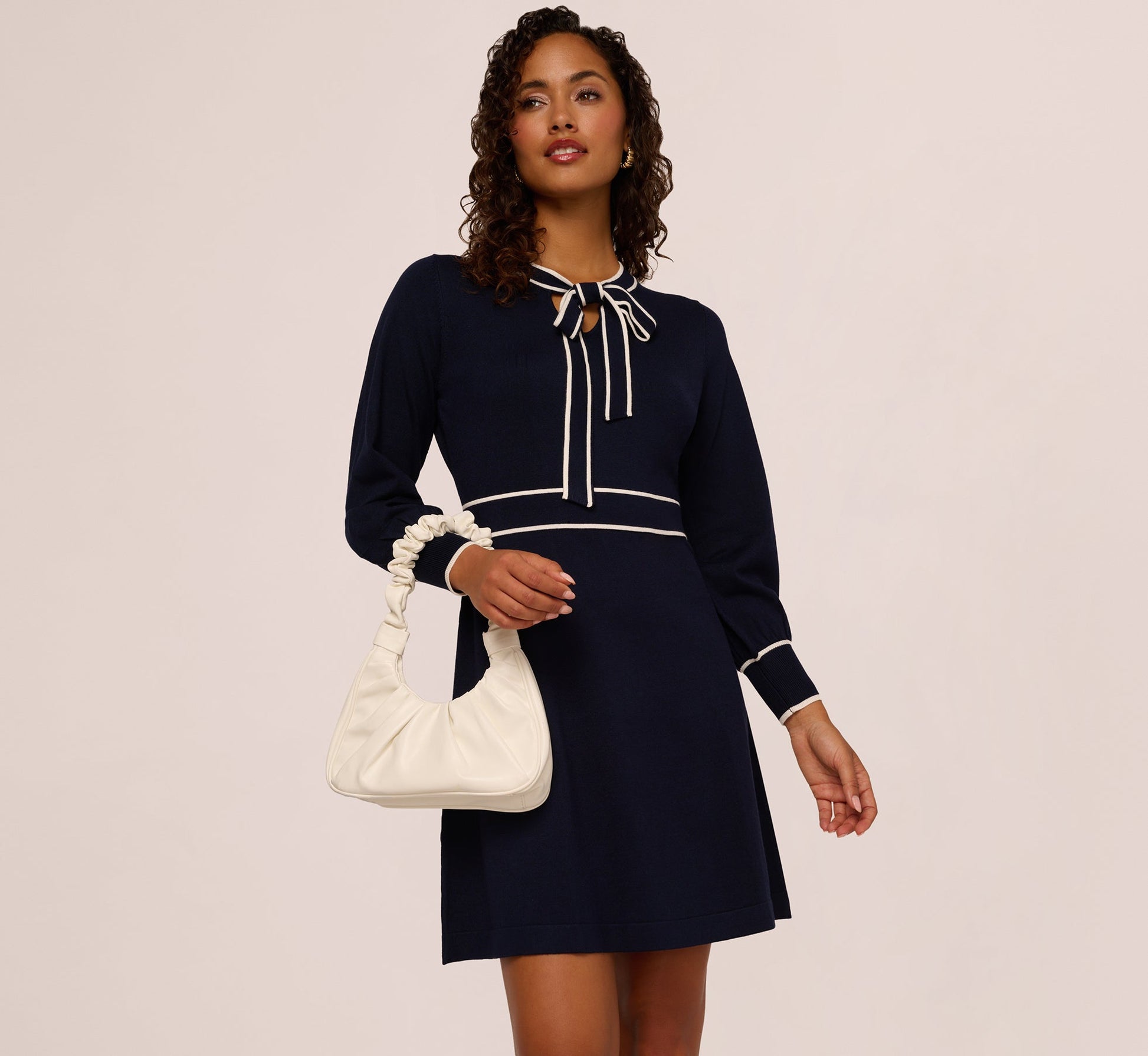 This short sweater dress blends softness and structure with its cozy knit fabric and polished contrast tipping. The fit and flare silhouette is framed by elegant bishop sleeves and trimmed with sharp contrasting lines at the waist, cuffs, and collar. A charming tie neck detail completes the design, making it a go to for put together work and weekend looks.